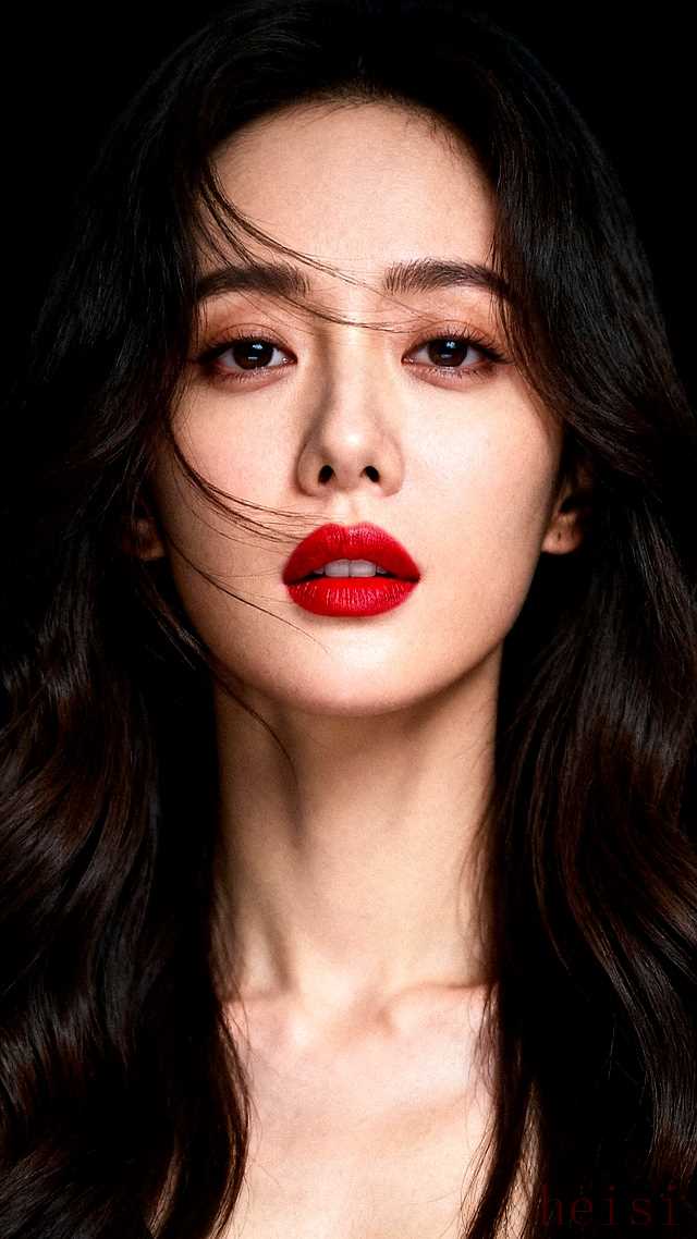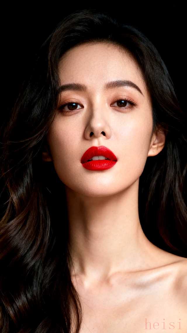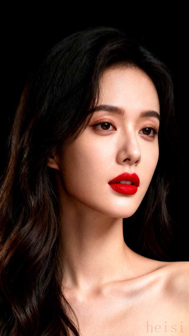 "场景:" 浪漫红唇与卷发的碰撞!黑背景下的高级感美妆肖像。