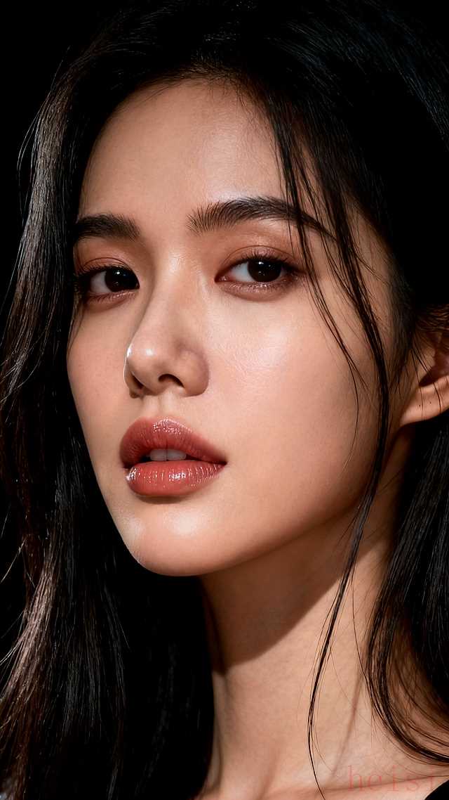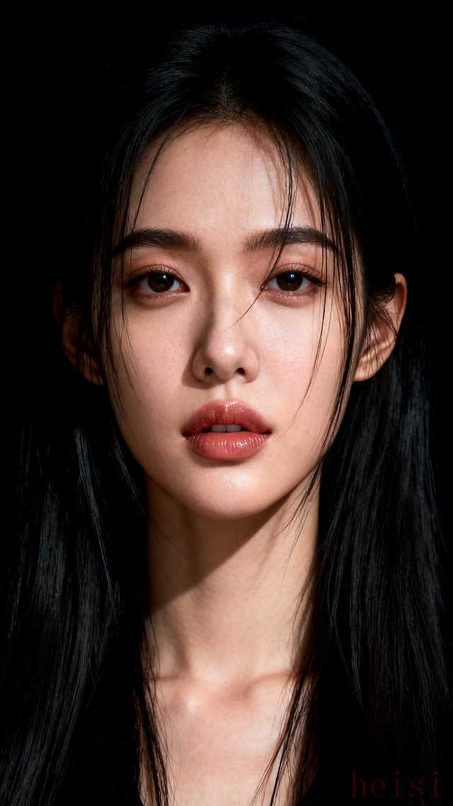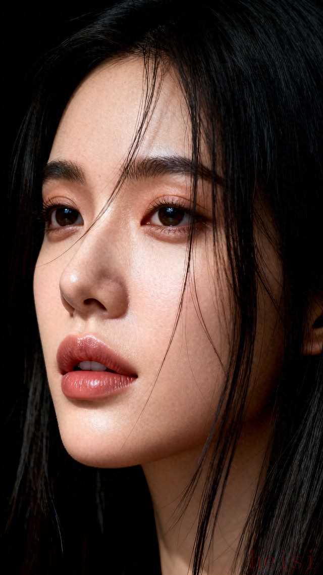 "背景:" 主体是深邃、纯净的黑色背景,如同丝绒般质感,营造出强烈的视觉焦点,将所有注意力吸引到人物和妆容上,并赋予画面一种高级、神秘的氛围。