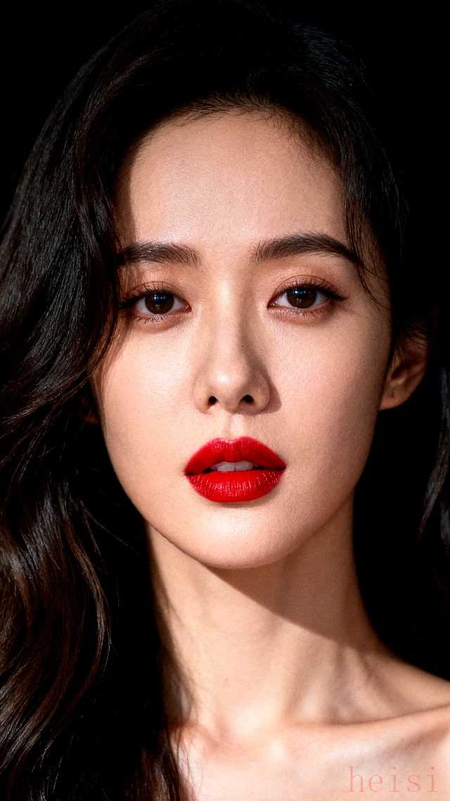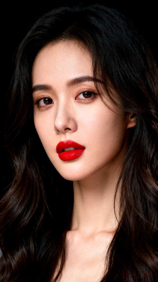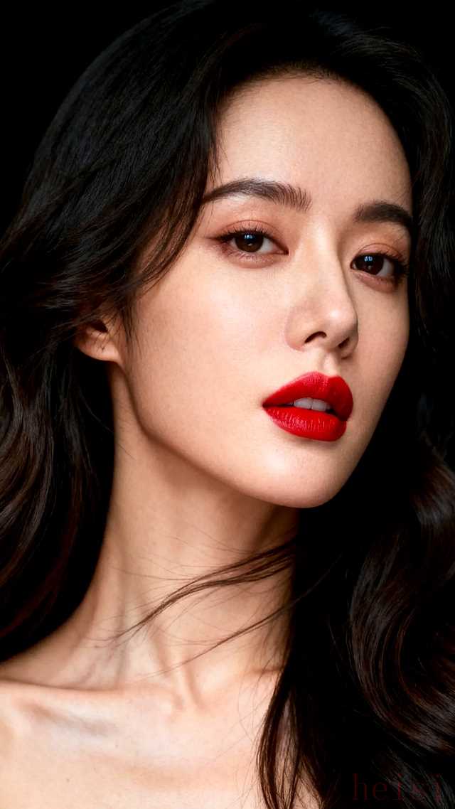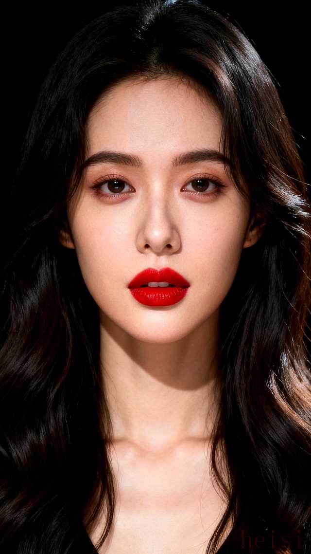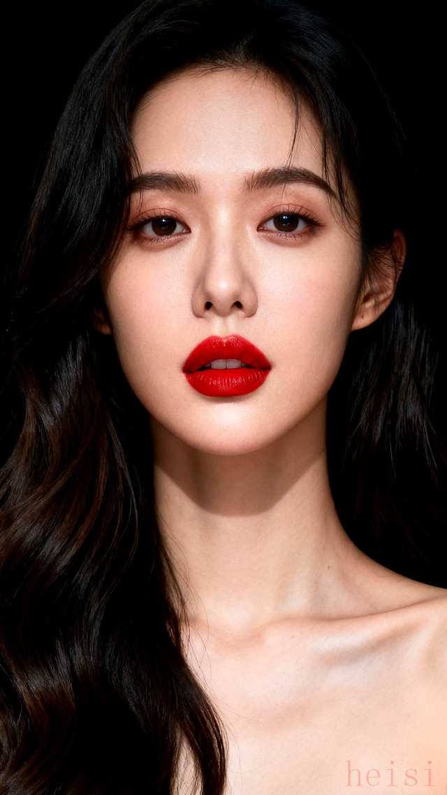 "红唇:" 她的嘴唇是画面的绝对焦点。涂抹着饱满、浓郁、饱和度极高的正红色唇膏,唇线清晰,唇部轮廓分明,可能带有一点点光泽感或哑光感,但无一例外地显得精致而性感。红唇的颜色与头发或服装(如果穿着)形成色彩上的对比或和谐。