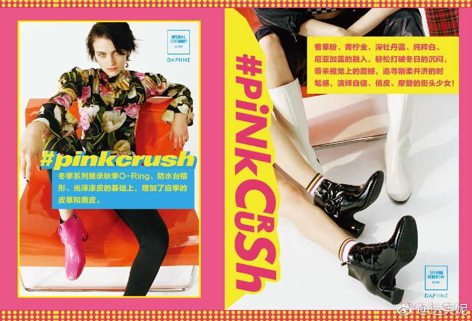 2017年夏天,达芙妮和纽约市SoHo区的潮流买手店Opening Ceremony出人意料地进行了联名合作。当时的达芙妮正面临连续第三年的亏损,市值大幅度缩水,累计关店近3000家。达芙妮为Opening Ceremony搭建了专门的供应链,生产透明鞋跟和大红弹力布的靴子;用雀斑厌世脸的欧美模特拍摄拍摄产品广告——过去这个品牌的形象代言人是刘若英或者台湾女子乐团S.H.E——它还在上海淮海路的连卡佛前搭建了一座粉红潜水艇造型的快闪店。
