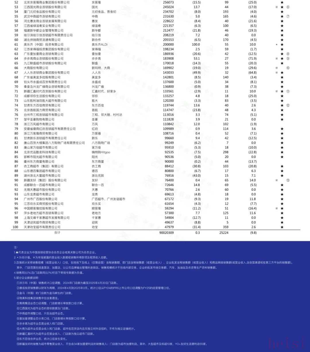 中国连锁经营协会(CCFA)7月9日发布的《2024年中国超市TOP100》榜单显示,上榜企业销售规模约为9000亿元,同比微增0.3%,门店总数2.52万个,同比下降9.8%。
