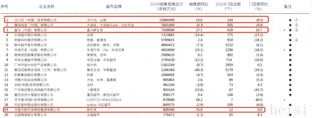 其中,沃尔玛(中国)以1588.45亿元销售额蝉联榜首,盒马(中国)以750亿元首次跻身前三,胖东来以80.94亿元销售额位列第19名。
