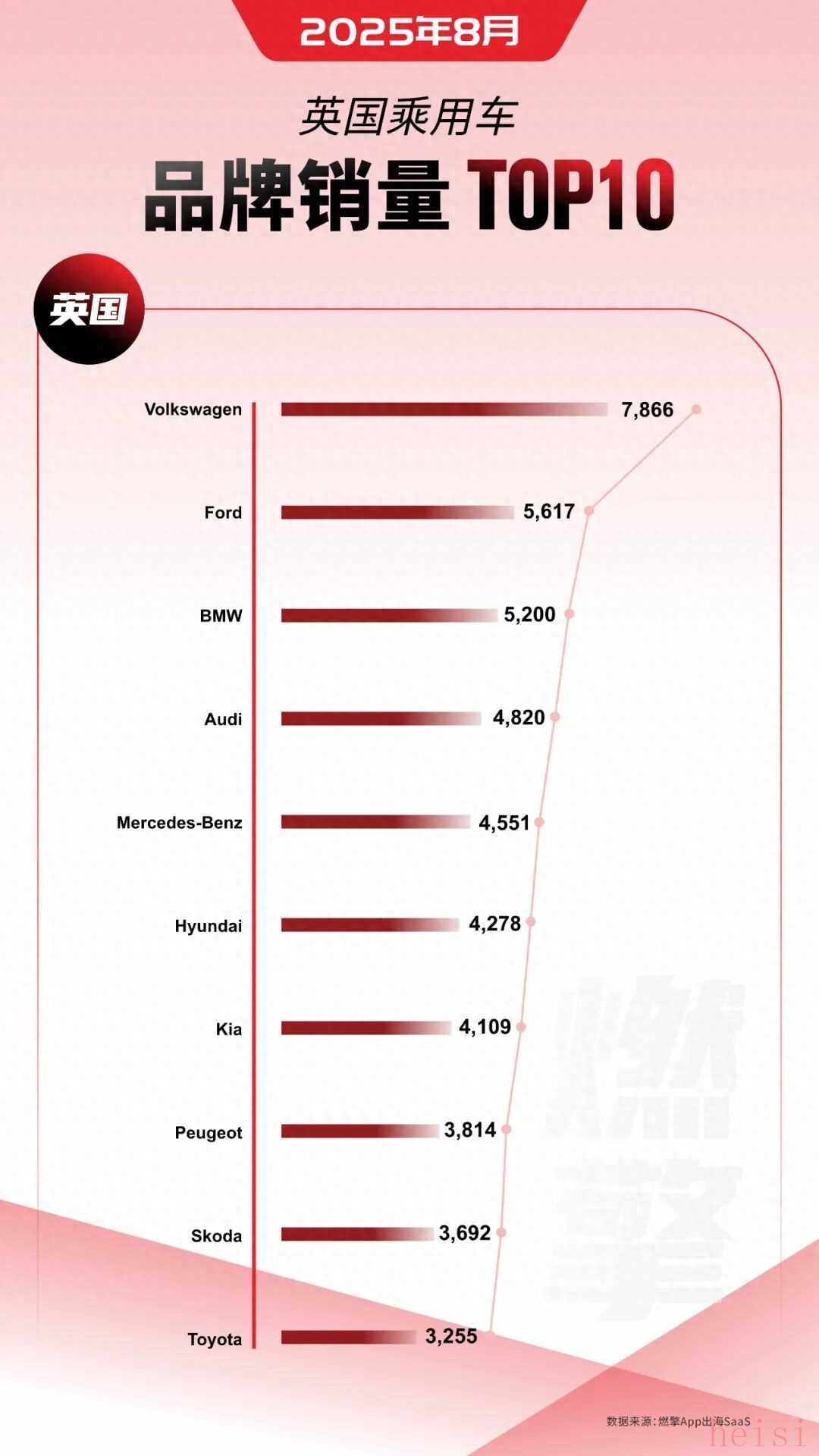 8月英国乘用车市场呈现大众领跑、豪华品牌强势、韩系性价比突围、日系转型滞后的格局。一、大众以产品矩阵优势登顶大众以7866辆销量登顶,其在英国市场依托传统燃油车(如高尔夫系列)与新能源车型(ID系列电动车)的全矩阵布局,结合品牌认知度和本地化服务,巩固了市场统治力,成为英国消费者覆盖“经济型到中高端”需求的首选品牌之一。二、豪华品牌集体跻身前列宝马(5200辆)、奥迪(4820辆)、奔驰(4551辆)占据销量前三至五位,凸显英国市场对豪华品牌的旺盛需求。这些品牌凭借电动化技术(如宝马iX、奥迪e-tronGT)、智能化配置(MBUX系统、奥迪虚拟座舱)及品牌溢价,在高端市场形成竞争壁垒,成为消费升级趋势下的核心受益者。三、韩系品牌以性价比与设计突围现代(4278辆)、起亚(4109辆)跻身前十,其高性价比车型(如现代IONIQ系列电动车、起亚EV6)+年轻化设计精准击中英国年轻消费者和家庭用户需求,在“主流经济型市场”与“新能源细分领域”实现双重突破。四、日系品牌转型节奏滞后丰田以3255辆排名第十,相对靠后。这反映出其在英国市场电动化产品布局节奏偏缓,新能源车型(如bZ系列)的市场接受度和渠道覆盖尚未形成规模,导致在竞争激烈的英国市场份额被其他品牌挤压。五、本土与欧洲品牌依托本地化运营生存福特(5617辆)作为美国品牌,凭借皮卡、家用车系列的传统优势在英国站稳脚跟;标致(3814辆)、斯柯达(3692辆)则依托欧洲本土供应链和经济性车型(如标致208、斯柯达明锐),在细分市场维持竞争力。大众的集团化产品优势将持续巩固其头部地位;豪华品牌需在电动化技术迭代(如纯电平台、续航升级)上持续发力以维持溢价;韩系品牌可通过新能源车型(如现代Ioniq6、起亚EV9)进一步渗透主流市场;丰田等日系品牌若不加快电动化产品投放与本地化运营,市场份额或持续收缩。