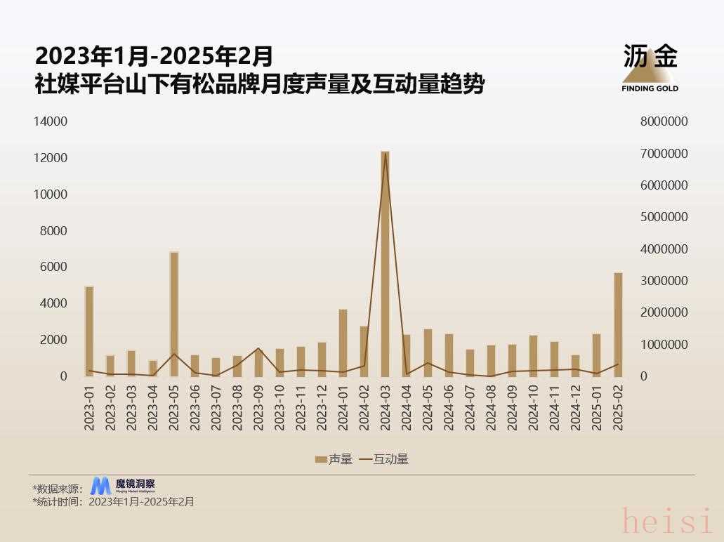 从近一年品牌社媒热度来看,声量同比增长48.2%,互动量同比增长167.7%。2024年3月的品牌热度主要是卢昱晓合作所带动,2025年2月与文淇的合作推广更是进一步推高品牌热度。