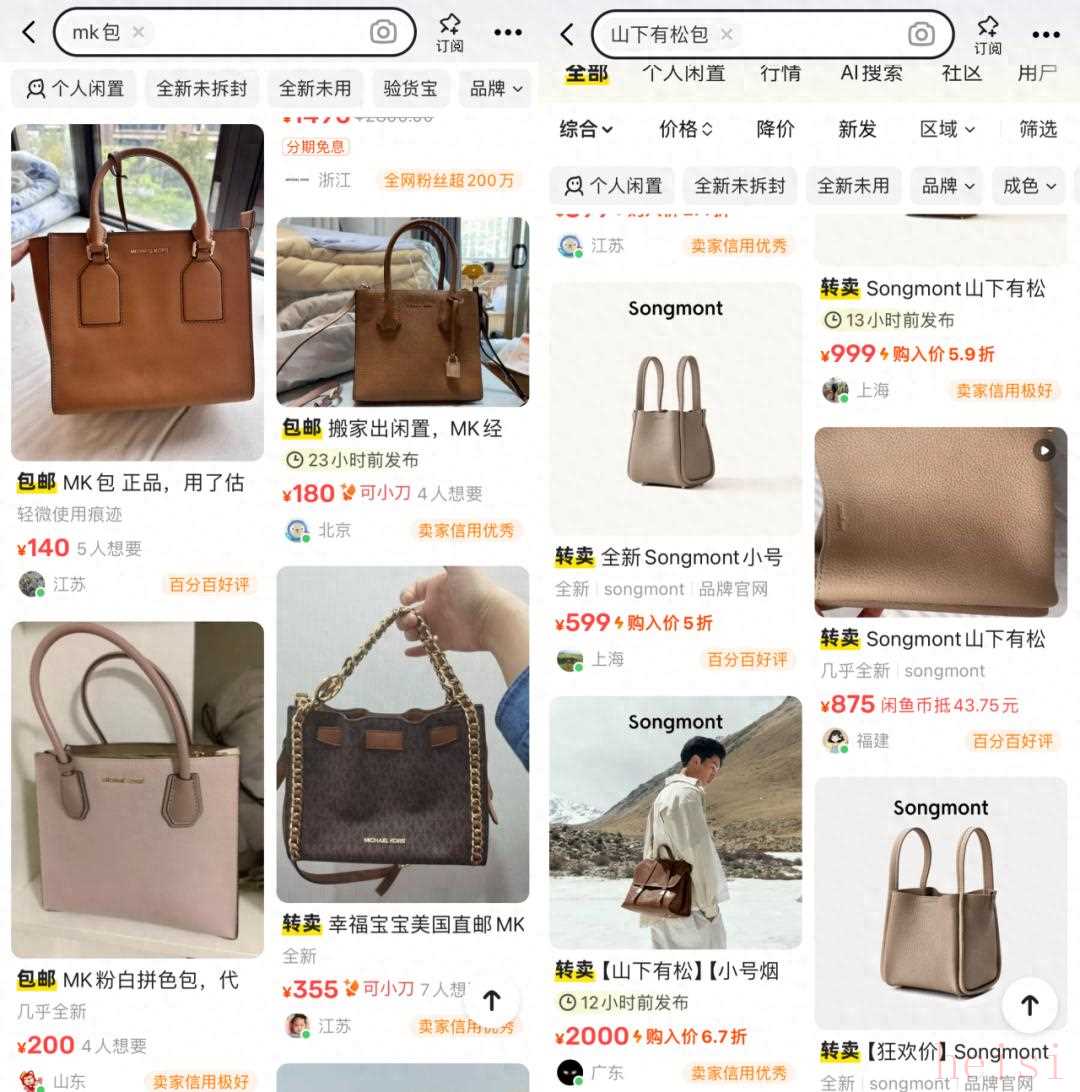 二手平台上山下有松与轻奢品牌价格对比 来源:闲鱼