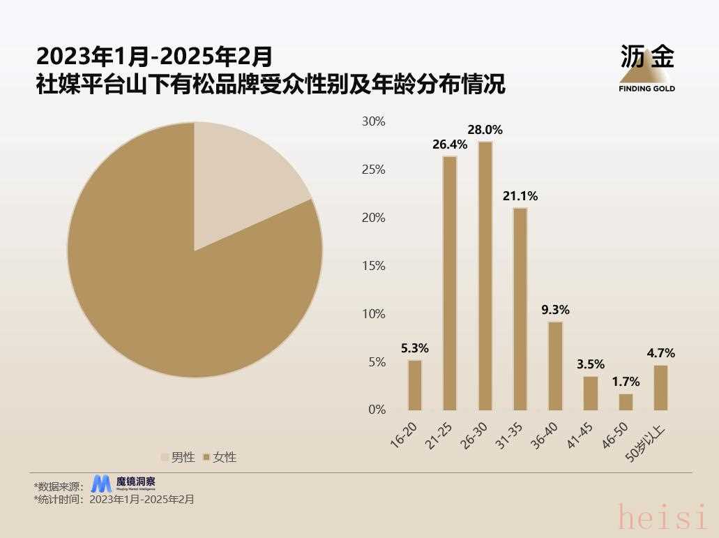 高频营销的结果也十分直接,一方面是社媒和销量的双增,另一方面品牌受众也越集中于21-35岁的女性群体。从品牌社媒受众来看,该年龄段占比也达到65%,正是具有一定消费力的中青年群体。
