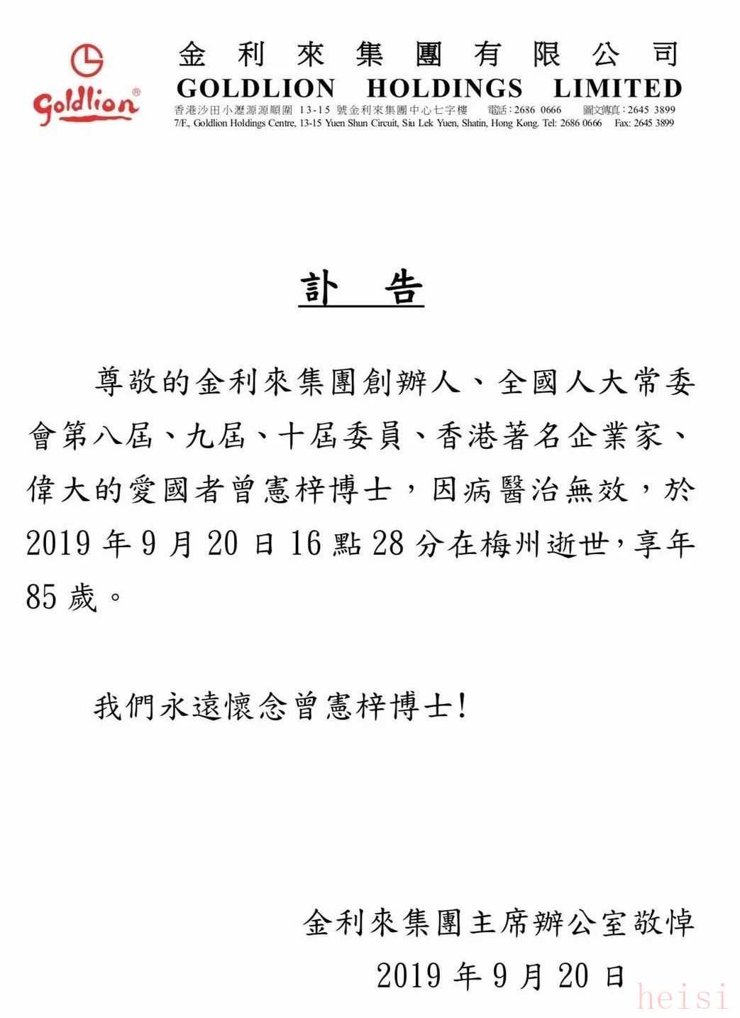 原全国人大常委、香港金利来集团创办人曾宪梓于2019年9年20日下午因病去世,享年85岁。金利来集团发布了讣告。