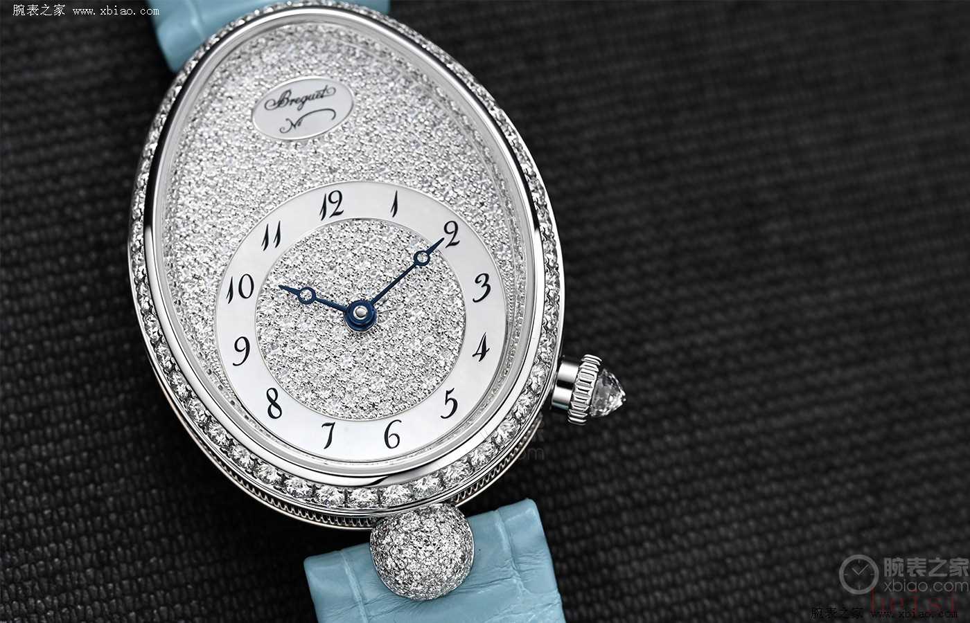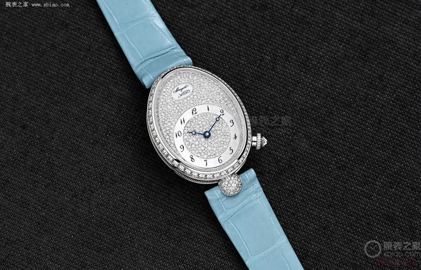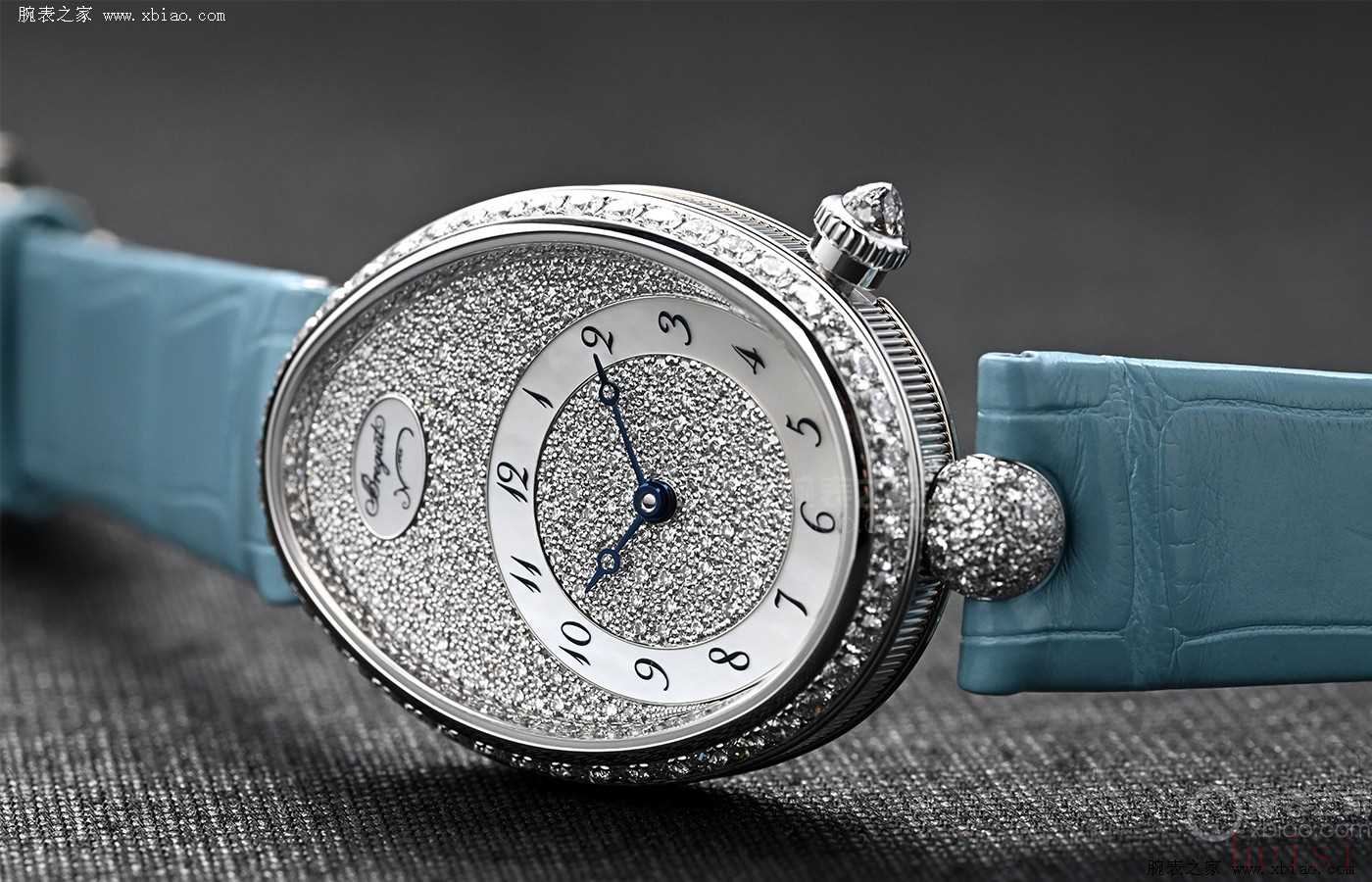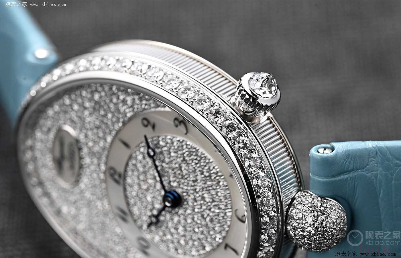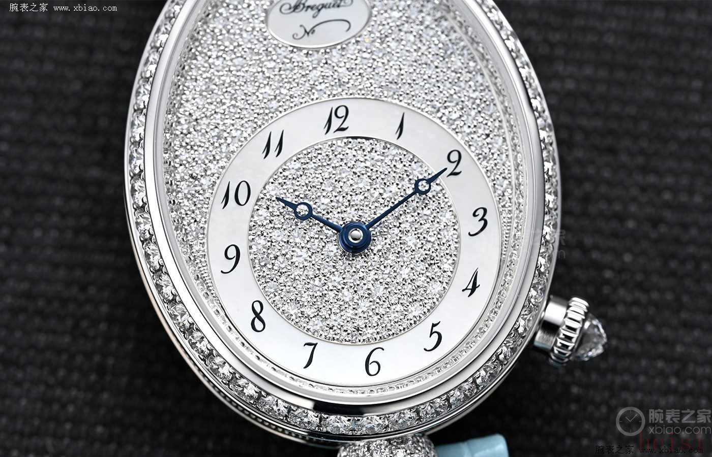 今天来聊的这枚腕表算是系列中日常佩戴款的“顶配”了,满钻的表盘搭配上淡蓝色的表带,简直太美了。宝玑在钻石镶嵌上采用的是独特的“serti neige”(雪花镶嵌),在钻石的挑选上也会经过严格的质检,保证呈现出最佳的品质。