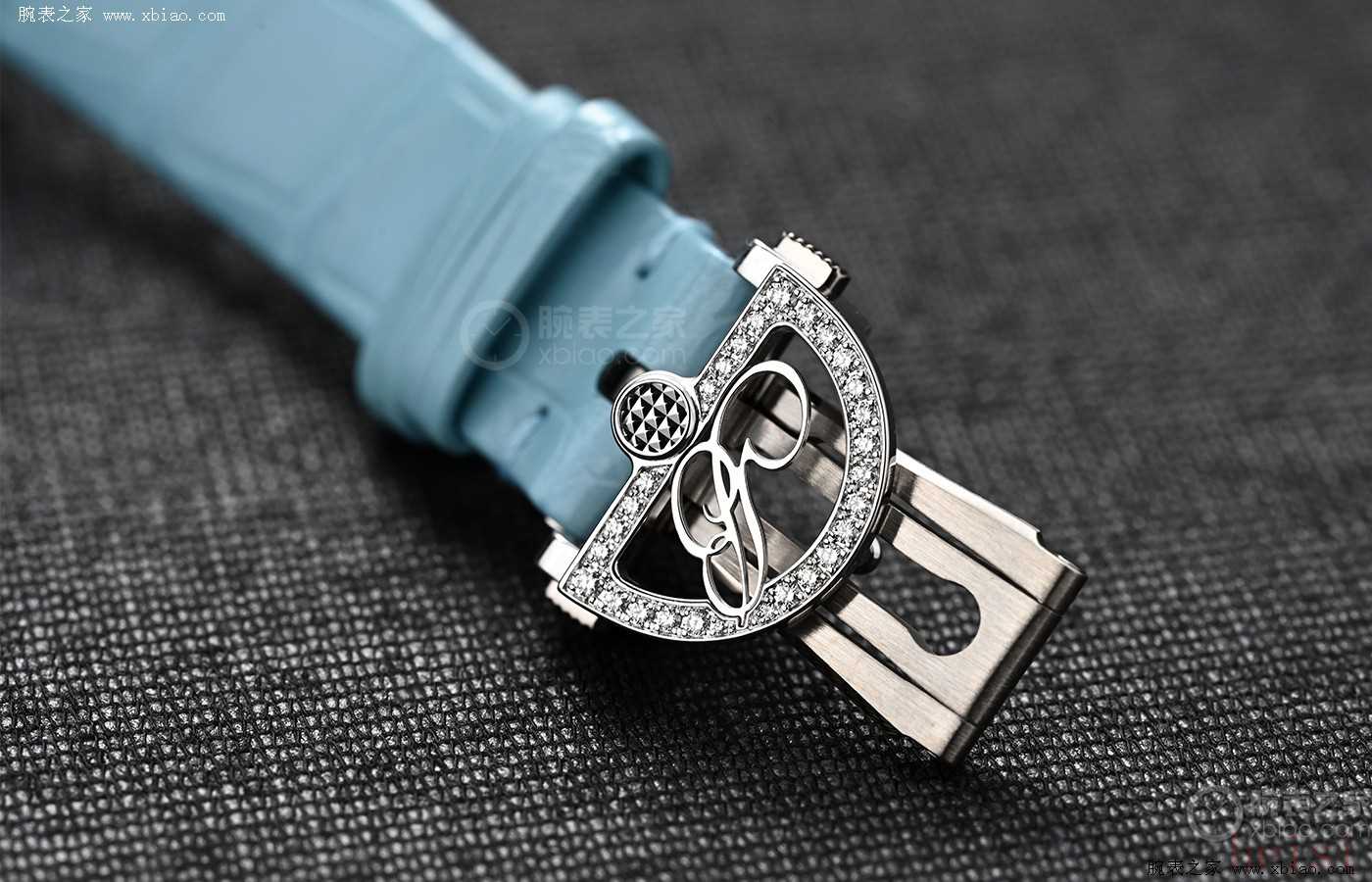 表带采用的是鳄鱼皮,大大提高佩戴舒适度。这枚腕表细节到了表扣,镶嵌了28颗钻石并配有艺术字体的品牌首字母“B”,与表盘进行呼应。