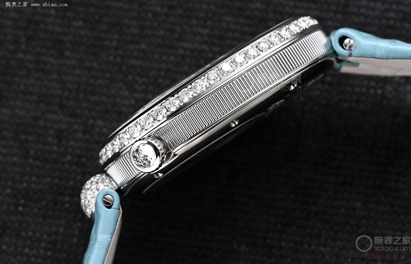 腕表的表壳和表圈均采用白金材质,虽然覆以钻石但在材质上宝玑可是一点不含糊。表壳侧面采用了钱币饰纹,不仅防滑防手印,还相当美观。