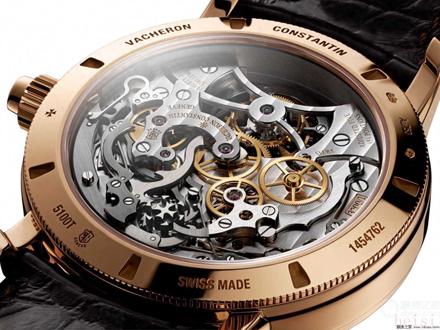 江诗丹顿42.5毫米玫瑰金款传袭系列陀飞轮计时码表(型号:5100T/000R-B623)表背可见马耳他十字标志。