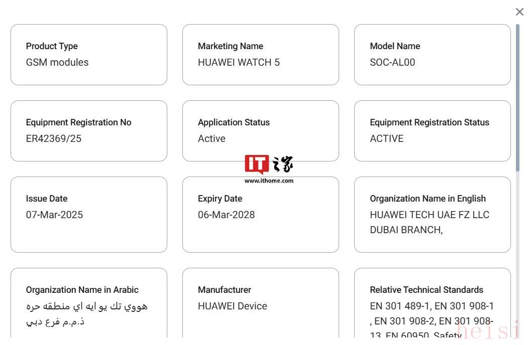 据IT之家此前报道,华为 WATCH 5 智能手表已通过阿联酋 TDRA 认证,设备型号为 SOC-AL00、注册号 ER42369/25,有望近期在海外上市。