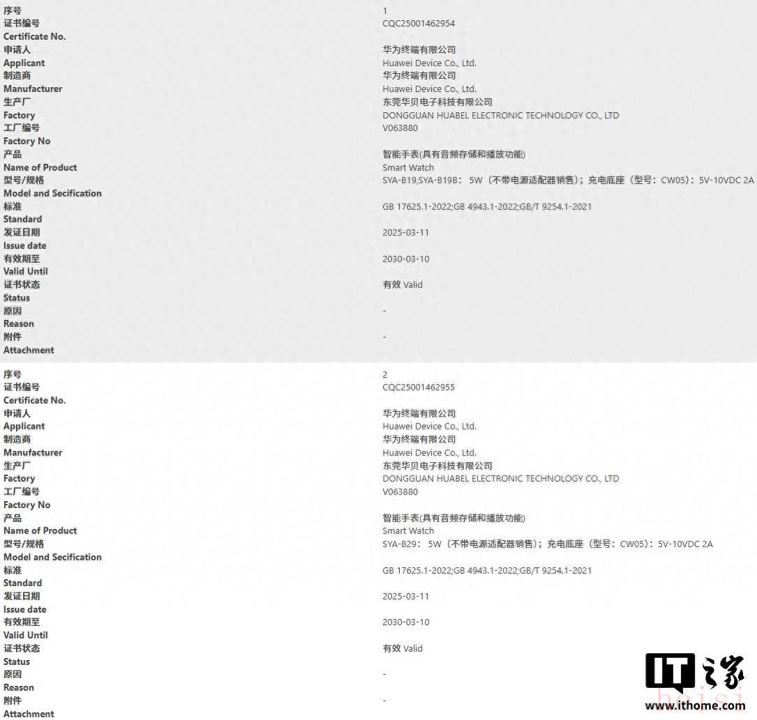 IT之家 3 月 12 日消息,型号为 SYA-B19、SYA-B19B、SYA-B29 的华为智能手表已通过国内 CQC 认证,均具有音频存储和播放功能。认证信息显示,三款智能手表不带电源适配器销售,配备型号为 CW05 的充电底座(5V-10VDC 2A)。