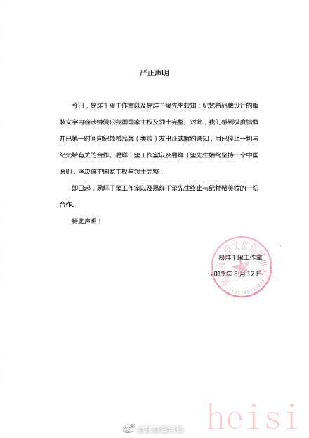 易烊千玺与纪梵希解约 【纪梵希道歉:坚决拥护一个中国原则】因纪梵希T恤将香港与台湾单独列为国家,12日中午,@易烊千玺JacksonYee工作室 发声明称:“易烊千玺工作室以及易烊千玺先生始终坚持一个中国原则,坚决维护国家主权与领土完整! ”@TFBOYS-易烊千玺 工作室表示,“已第一时间向纪梵希(美妆)品牌发出正式解约通知,且已停止一切与纪梵希有关的合作”。12日,@GIVENCHY纪梵希 发表致歉声明称,关于今日引起部分网友讨论的海外市场纪梵希印花T恤中的错误而引发大家的关注,对此深表歉意。“对于任何的人为疏忽与错误,我们一定立即纠正并引以为戒。”并表示纪梵希品牌一贯尊重中国主权,坚决拥护一个中国原则,坚定不移。 (北青报记者 张蕊)