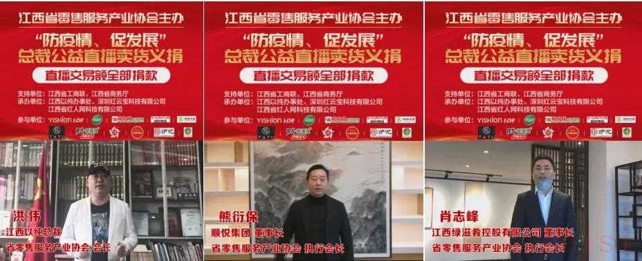 出席此次公益直播义捐活动并发言的领导有江西省工商联洪跃平副主席、江西省商务厅电商处饶芝新处长。洪跃平副主席表示,为深入贯彻落实习近平总书记关于坚决打赢疫情防控阻击战的重要指示精神,全面落实省委、省政府关于疫情防控的决策部署,按照省政府印发的《关于有效应对疫情稳定经济增长 20 条政策措施的通知》和《关于加强疫情科学防控推进全省企业复工复产的通知》要求,发挥关键时期工商联服务民营企业发展作用,在全省工商联系统开展“防疫情、促发展”活动,当前的新冠肺炎疫情对省内零售行业造成了巨大的冲击,江西省零售服务产业协会率先开展网上直播义卖活动非常有意义,对探索新零售模式推动实体和零售服务产业复工复产,弘扬了“厚德实干、义利天下”的赣商精神和责任担当。