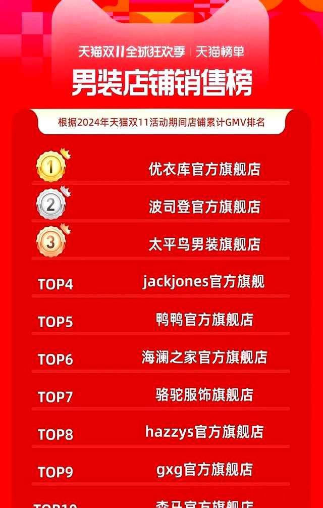 双11男装榜单,它跌出前五,落在第六到第十之间。