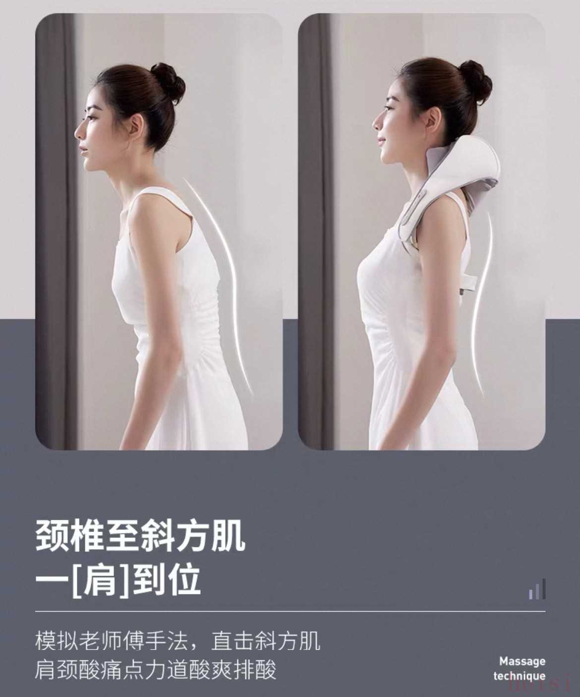 "推拿式:" 模拟推拿手法,力度适中,适合舒缓整个颈椎区域。