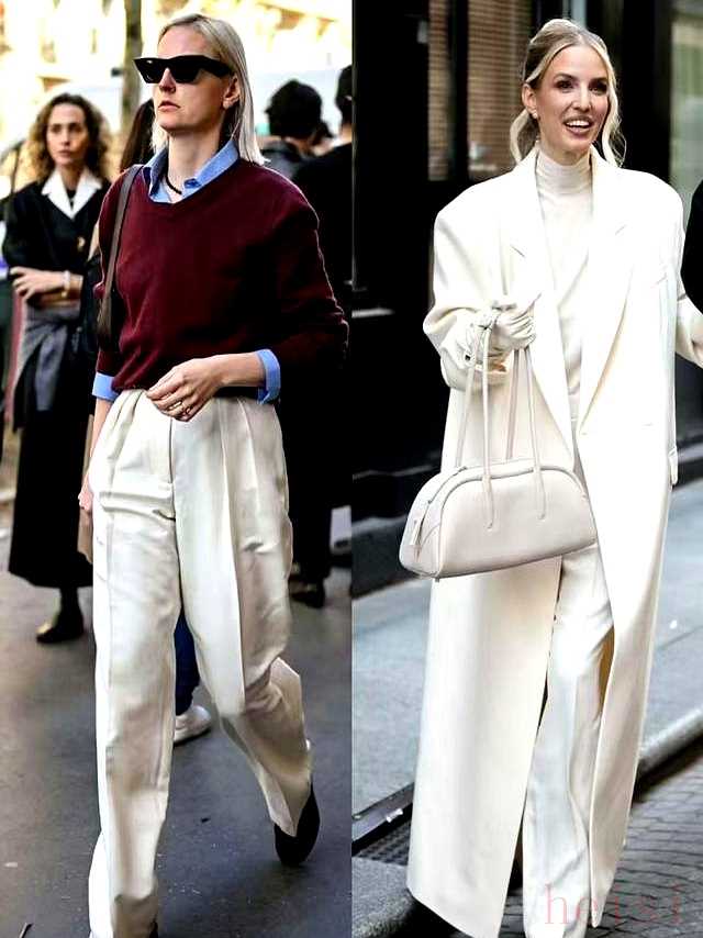 第三条是小白裤,不过今年升级成奶油色。香草白、杏仁白、浅米白,比纯白柔和,配驼色大衣不刺眼。灯芯绒和针织材质最吃香,手摸上去带温度,雪天坐地铁也不冰腿。