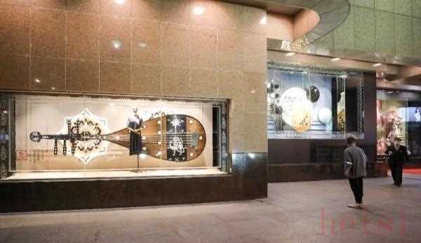 画梅粉香欲出,行书浓墨青黛,棋子金丝玉润,琵琶螺钿繁花……橱窗中,中国经典元素被有机组合成细致考究的环境,粉、墨、青、赭的国风色系男女时装一一秀出了精致高雅的国潮之美。路过的市民按动玻璃上的金色“礼”字,几秒钟后,橱窗里被解构的笔画居然会动起来,缓缓重新构成“东方”两字。