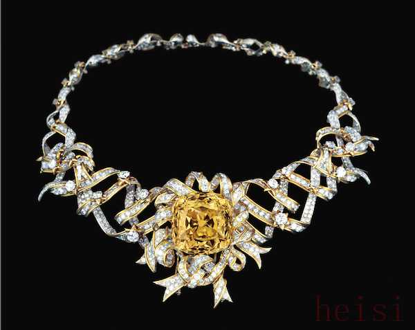这颗黄钻的第一次镶嵌是在1957年的这条钻石项链上。社交名媛玛丽·怀特豪斯夫人参加1957年蒂芙尼在罗得岛纽波特 (Newport) 举办的舞会上佩戴了这条项链,这也是蒂芙尼黄钻第一次被人佩戴。