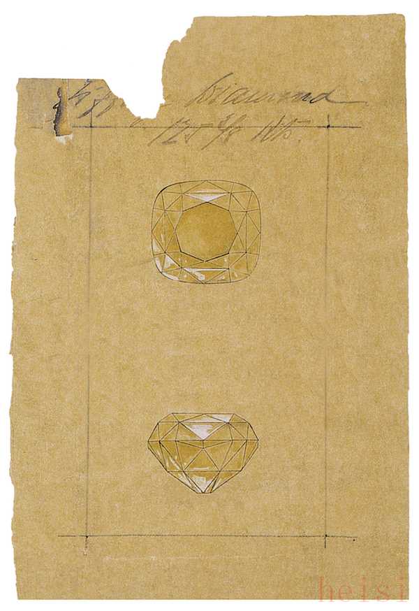 Tiffany Diamond切割设计草图与最终成品:重达128.54克拉的Tiffany Diamond