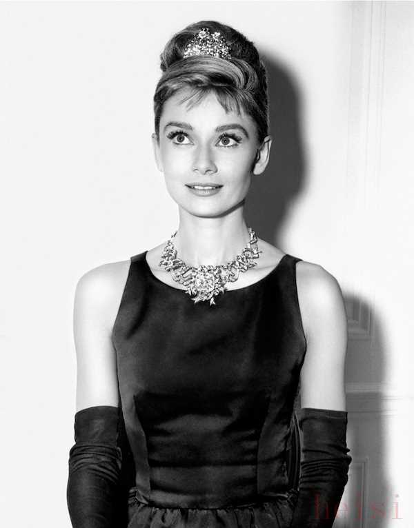 虽然赫本佩戴这条项链的造型被人熟知,但其实她在电影中并未真正佩戴,而是在海报中佩戴了真正的黄钻项链。这颗钻石直到现在也只被三个女人戴过,一位是社交名流玛丽·怀特豪斯夫人 (Mrs. Mary Whitehouse),一位就是赫本,而另一位,则是Lady Gaga——有趣的是,每次出现在她们身上时,这枚黄钻都以截然不同的姿态呈现。