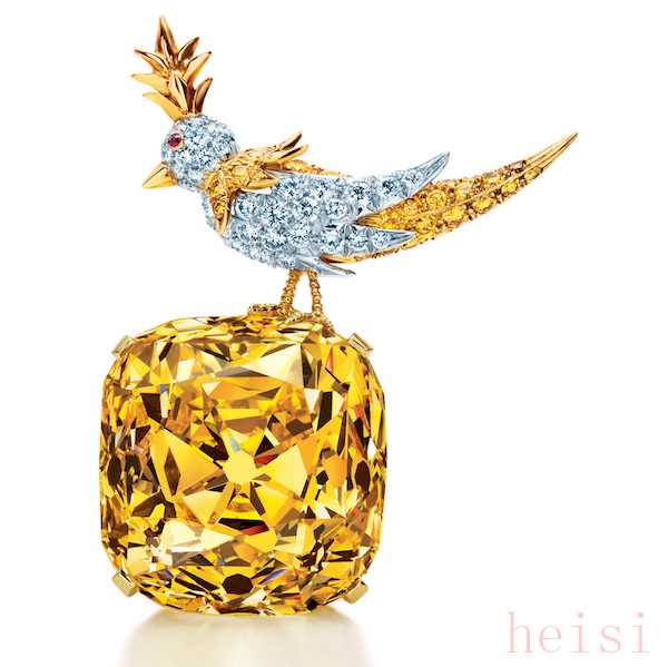 传奇黄钻第三次出现时,化作了一枚奇妙的“石上鸟”胸针:巨大黄钻之上,一只钻石小鸟停驻其上,形成巨大与小巧的强烈对比。这件作品同样是让·史隆伯杰打造,专为参加1995年的巴黎装饰艺术博物馆回顾展所设计。此次的设计也让“石上鸟”这一造型成为蒂芙尼的经典设计,衍生出许多巨型宝石与小鸟的胸针。