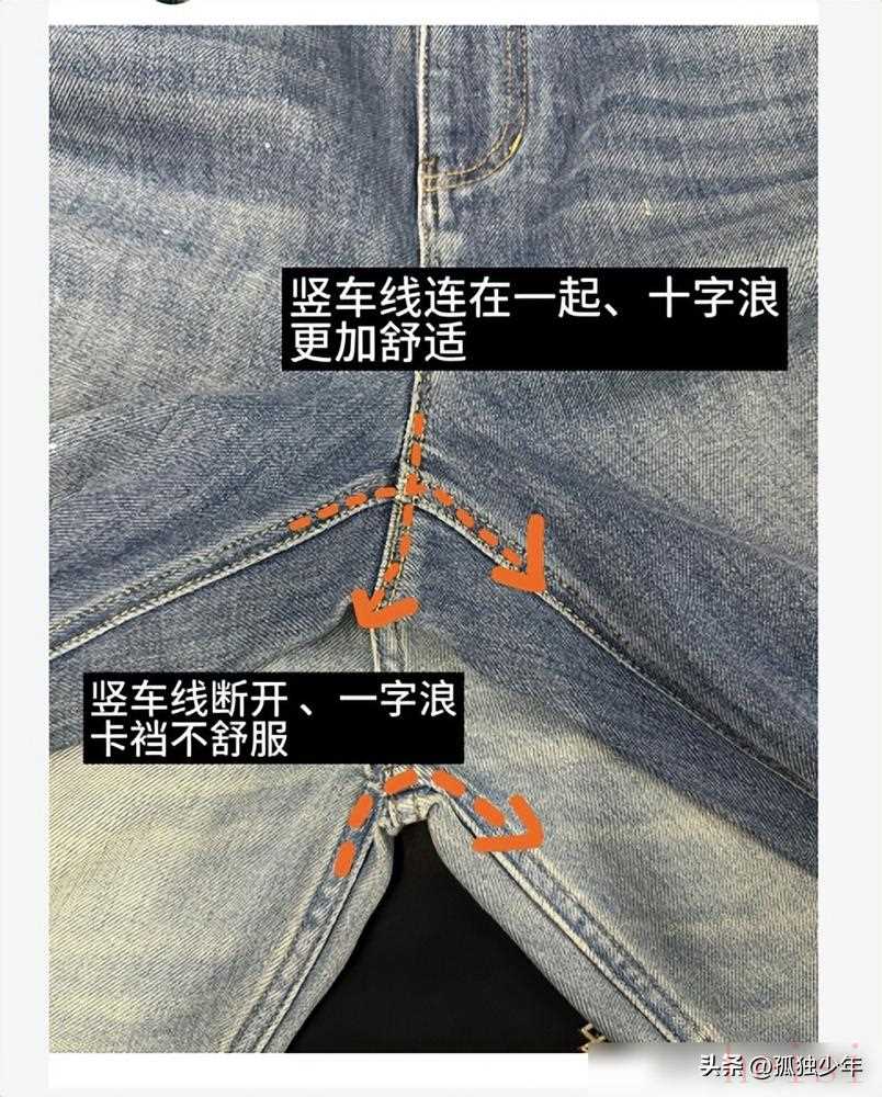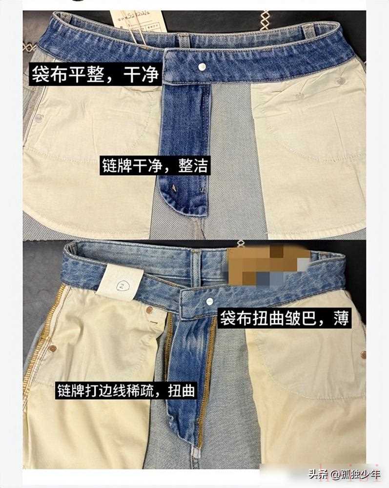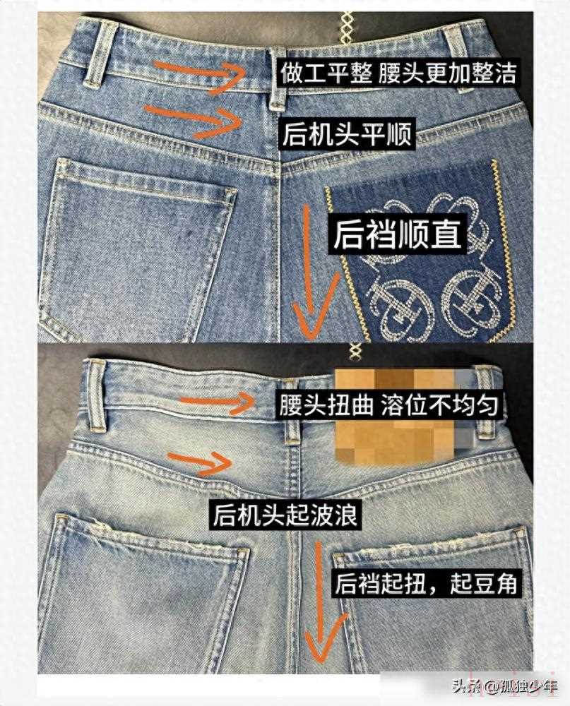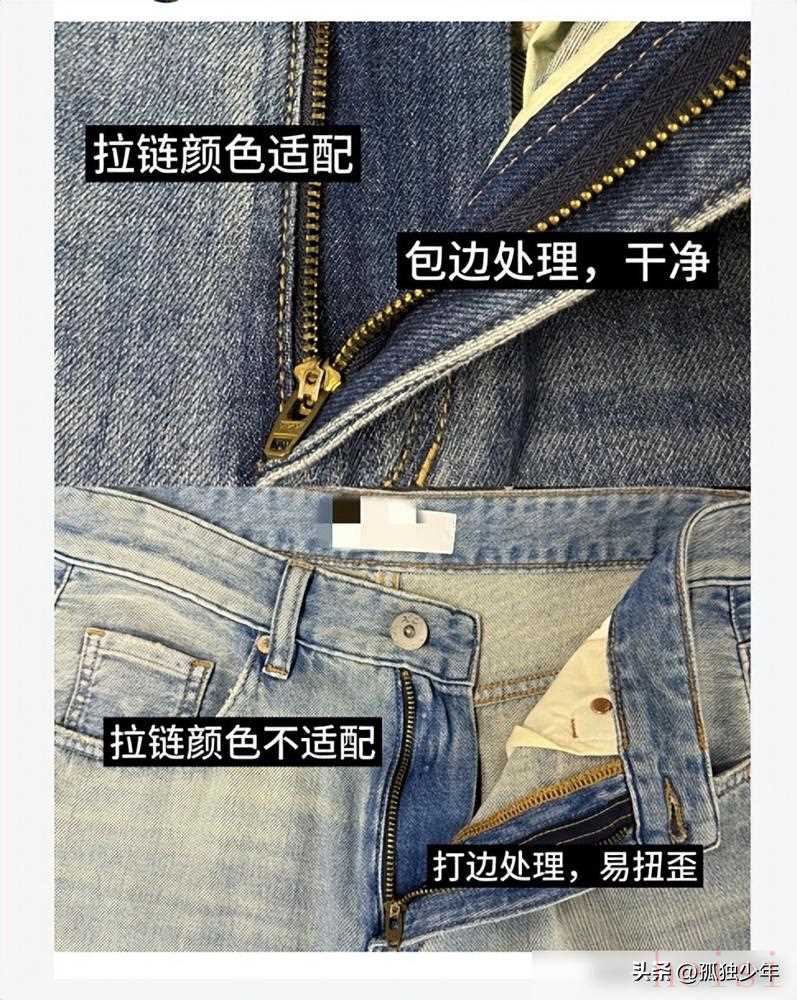 做工细节最戳心。百元款线头能绕裤脚一圈,纽扣松得像要掉,后兜缝线歪歪扭扭。千元款呢?YKK拉链顺滑得像抹了油,金属纽扣刻着品牌LOGO,后兜刺绣标细腻得能数清针脚,甚至后腰加巴黎扣,复古感直接拉满。
