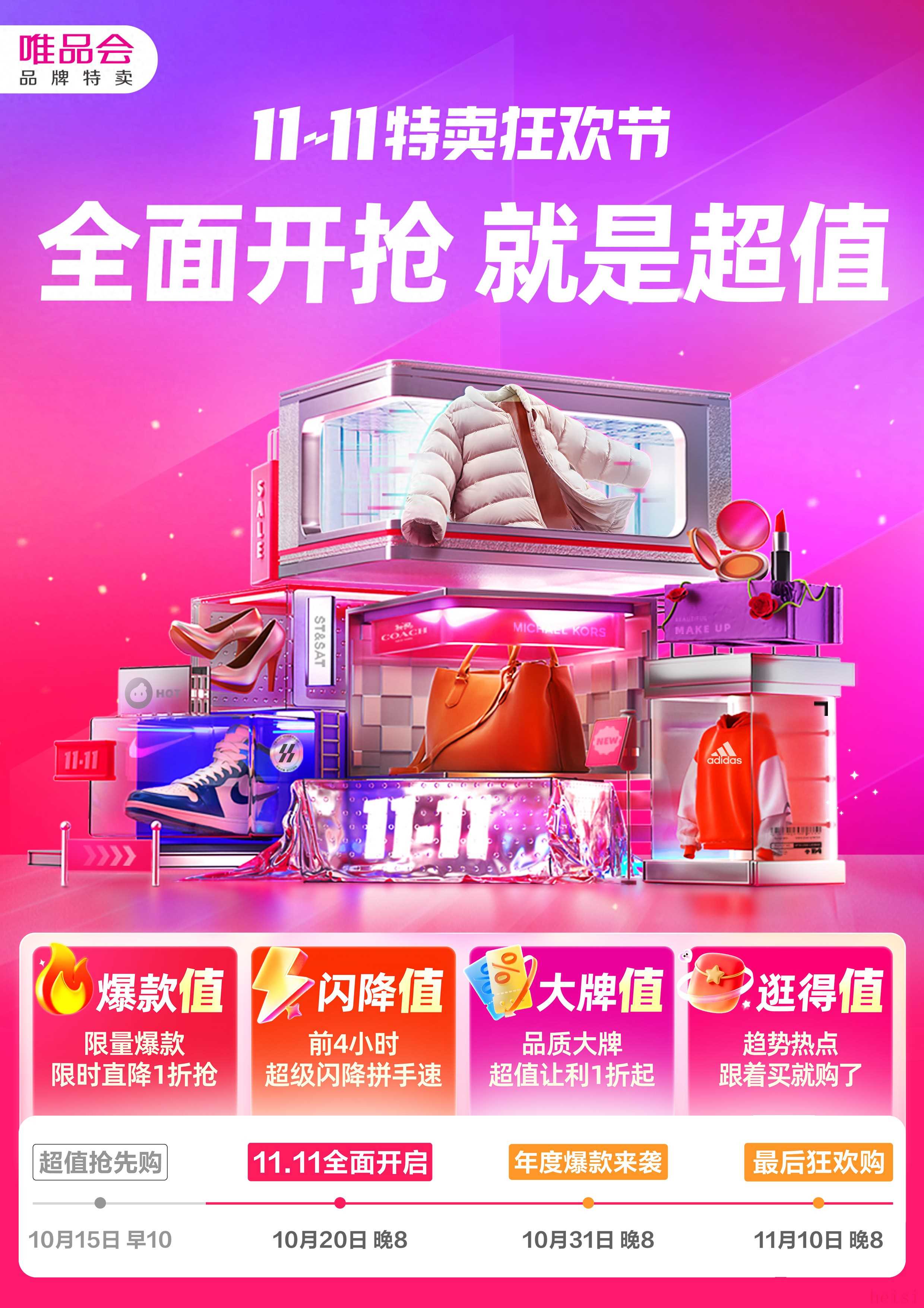 特卖电商唯品会消息,11.11特卖狂欢节将于10月20日晚8点正式开启。