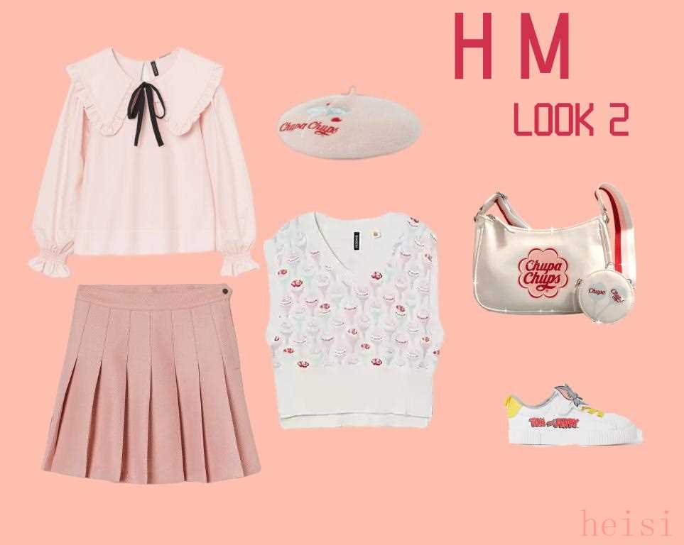 HM&Chupachups联名款,粉色是加上糖果印花,太甜了叭!粉色的娃娃领衬衫加上百褶裙很有学院感,再搭上带有米奇图案的板鞋,整一个青春无敌。