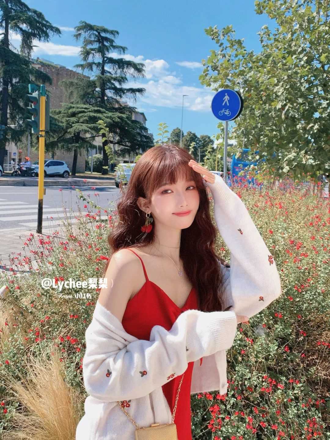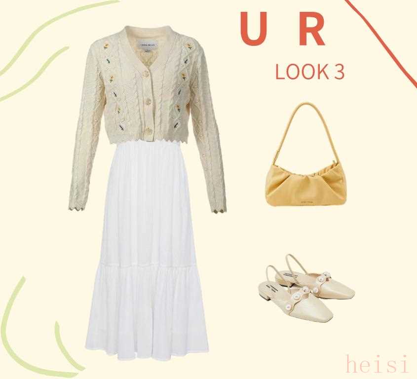 白色褶裙加上淡黄色毛衣太有初恋的感觉了!毛衣有小花和麻花线条点缀,设计感十足,里面是吊带裙,收腰遮腿粗,梨形身材姐妹一定要买到它!包包适合搭配软一点的,更有温柔的氛围。鞋子我也超爱,淡黄色跟上衣很好地呼应,还有珍珠点缀,很特别。