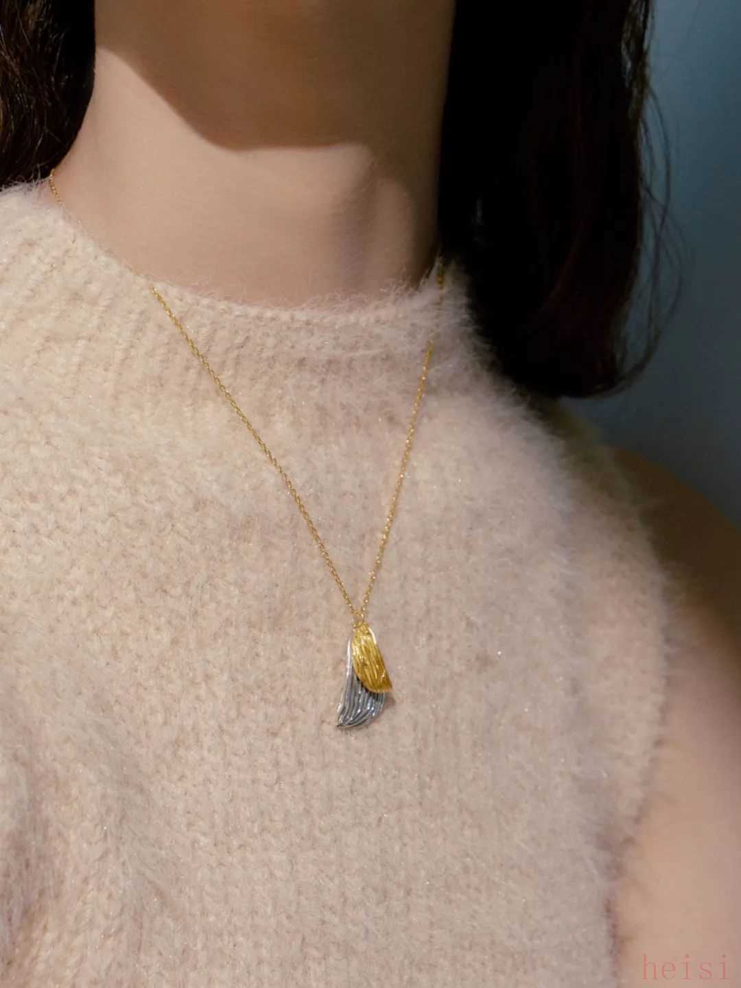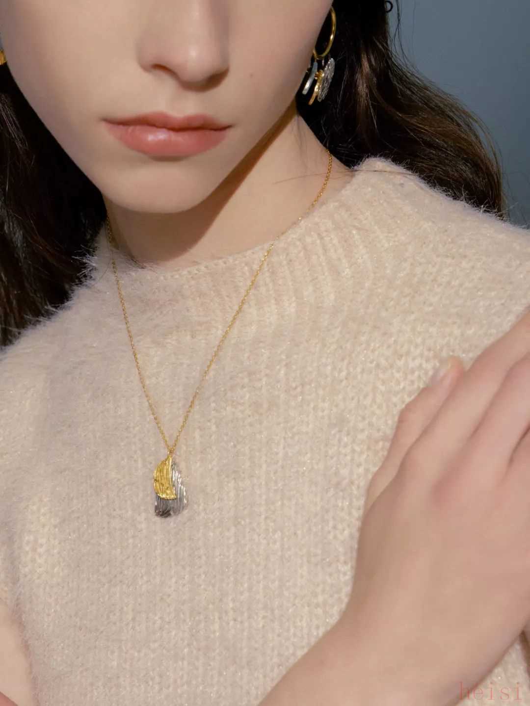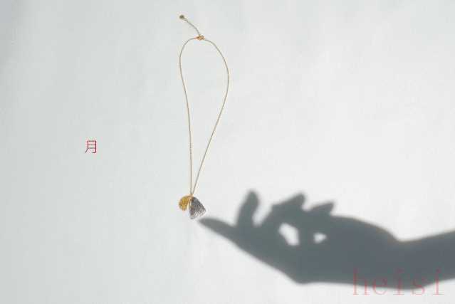 这条月色真美项链在设计的时候就花了不少心思,用独特的水波纹表现月光,金银两色的吊坠也做成了半月形,搭配金色的链条,特别有质感。