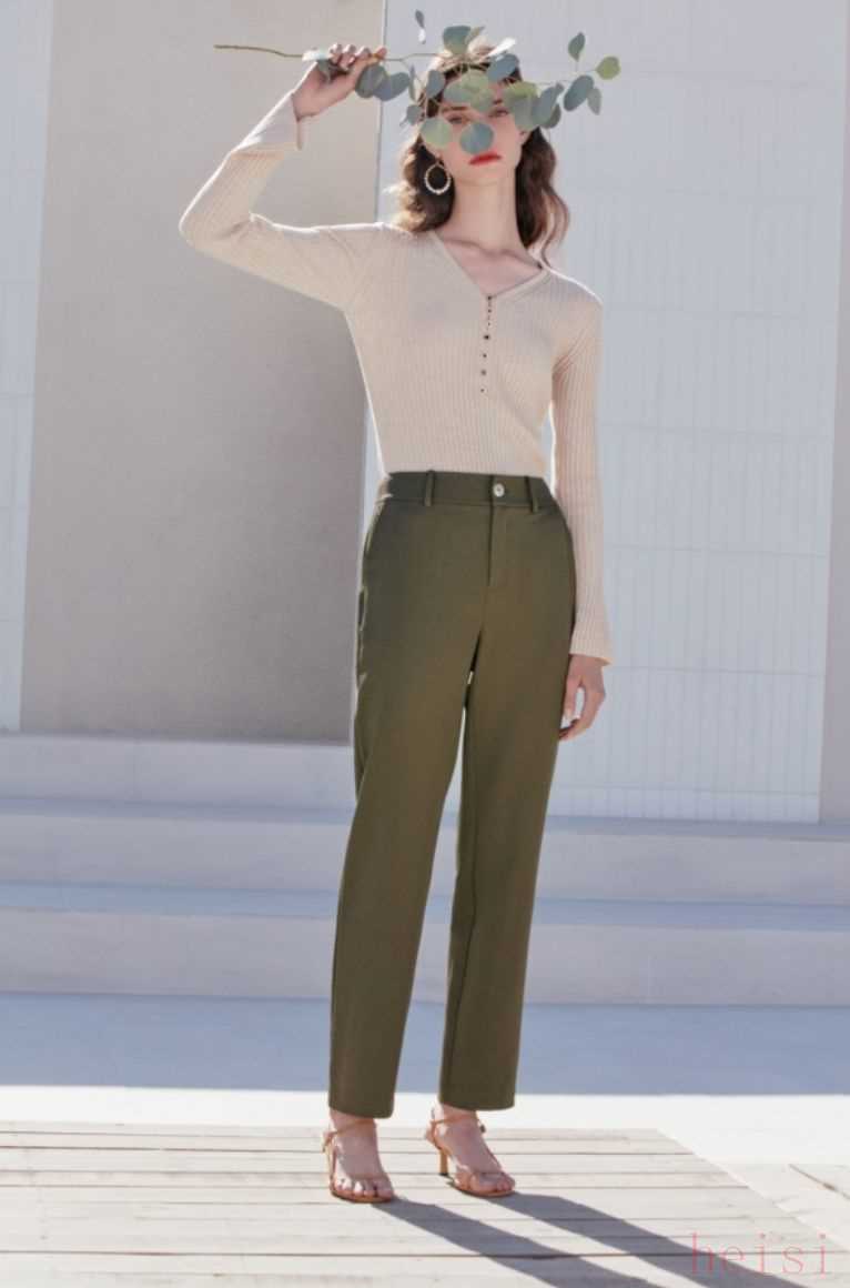 卡其色吸烟裤也是通勤的好选择,可以代替穿腻了的小黑裤。裤脚宽度更好,配短靴和单鞋都好看,利用率很高。▼