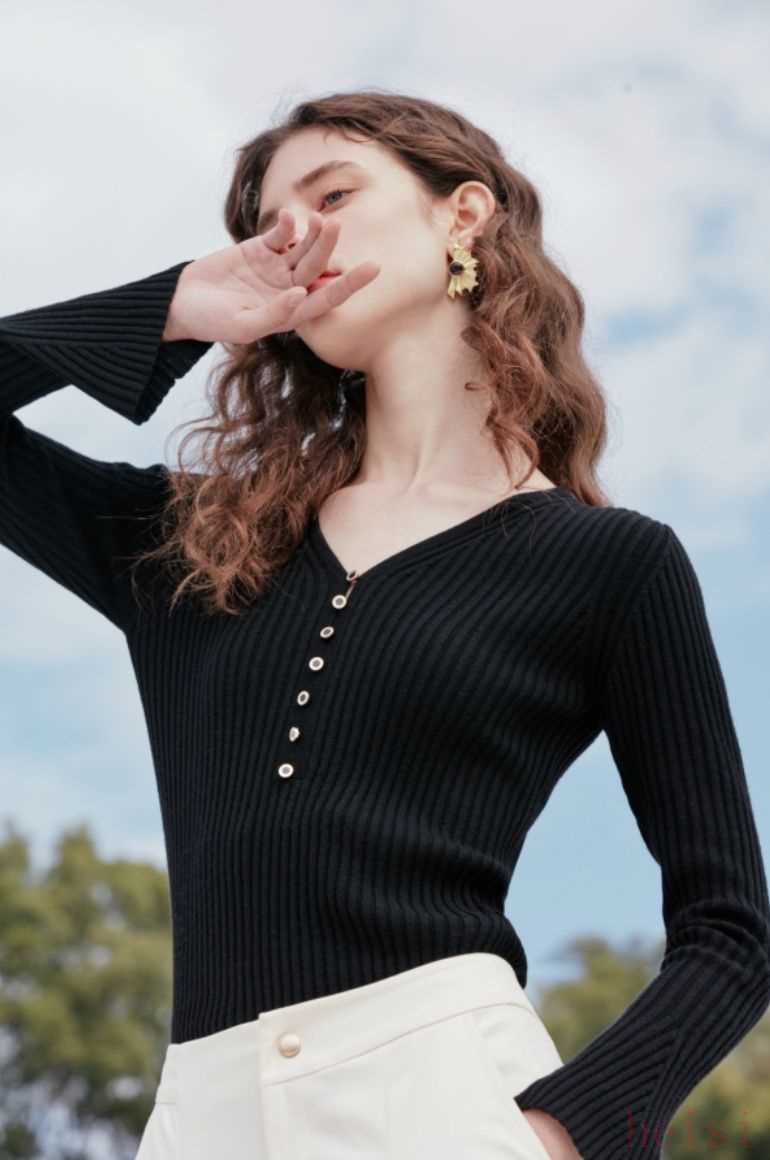 基础针织衫相信很多同学都有了,这件有很多设计上的小细节,单穿也不寡淡。点缀V领的黑金扣质感很好,前面几颗是可以解开调节的,下面几颗是装饰扣。▼