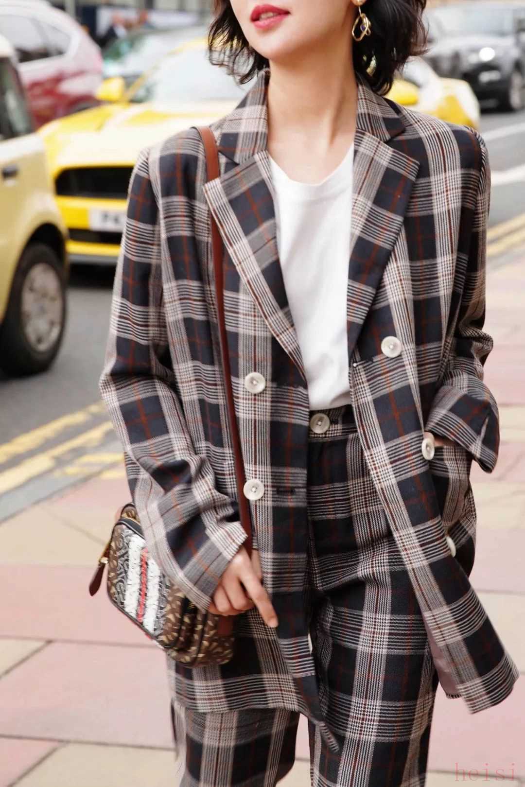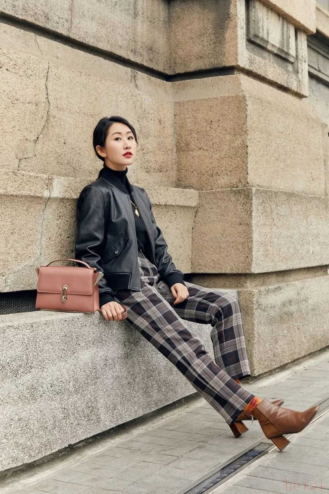 除了穿一套,这两件单穿也好看。格纹裤配皮衣▼