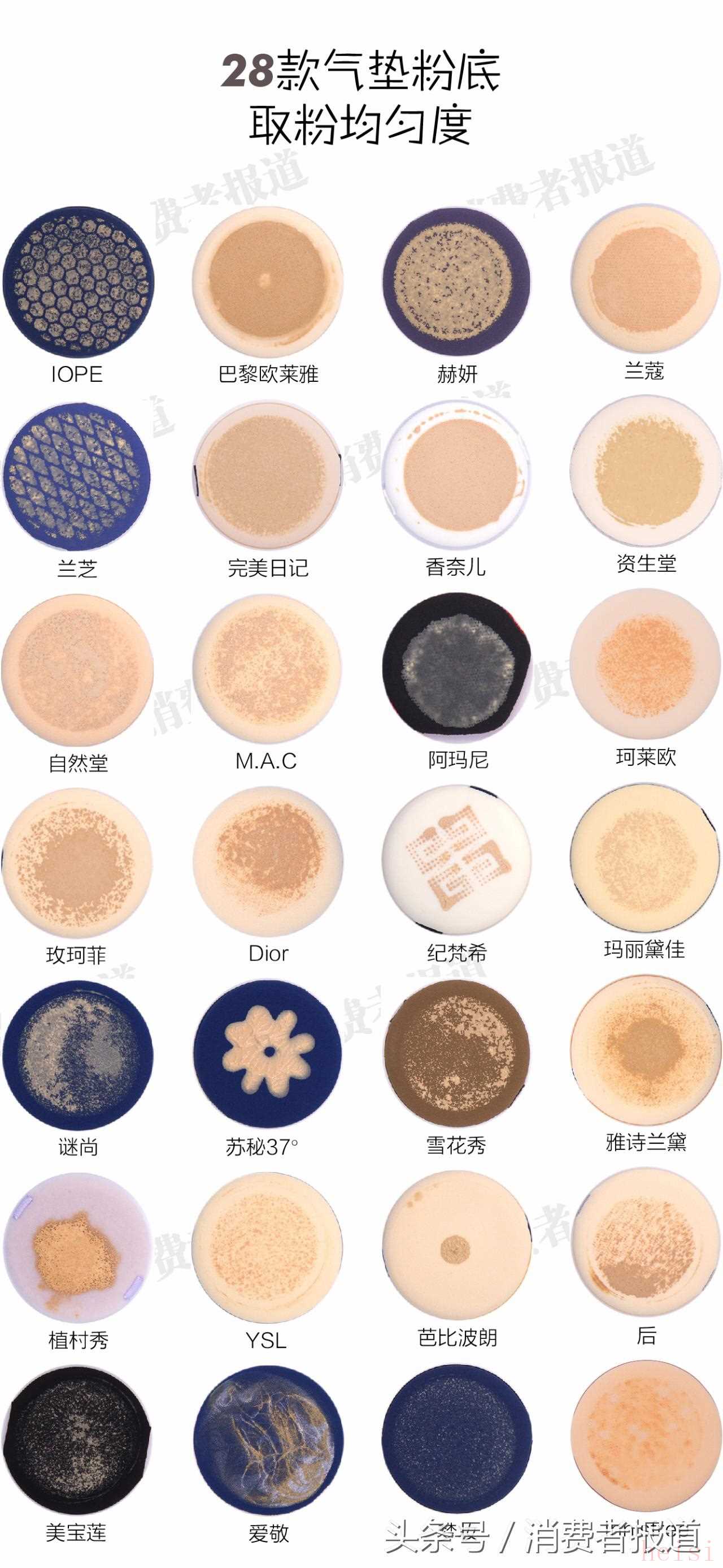 此外,由于气垫一般内置海绵粉芯及粉扑搭配使用,但如果取粉过多易造成浪费,过少又不易上妆,因此本刊还测试了粉扑蘸取粉底的均匀度。