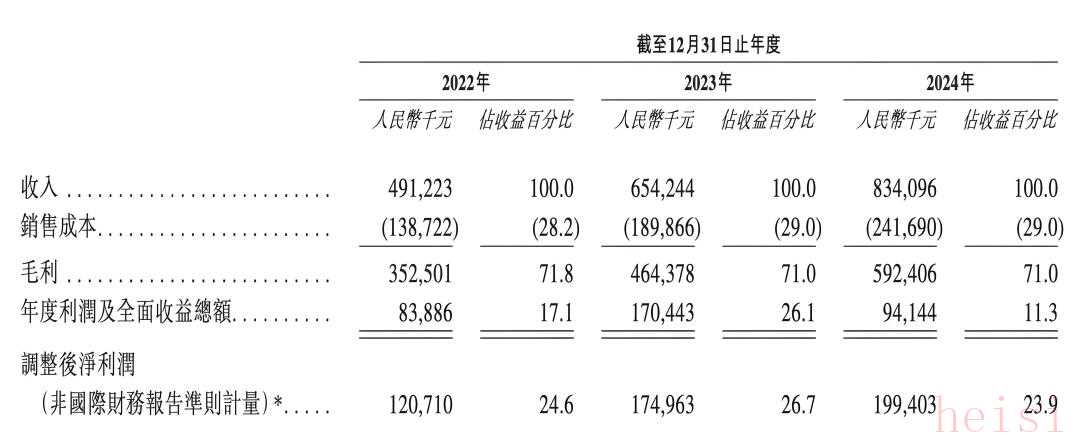 同期,毛利分别为3.53亿元、4.64亿元和5.92亿元。年度利润及全面收益总额分别约为8388.6万元、1.7亿元和9414.4万元。调整后净利润(非国际财务报告准则计量)分别约为1.21亿元、1.75亿元和1.99亿元。