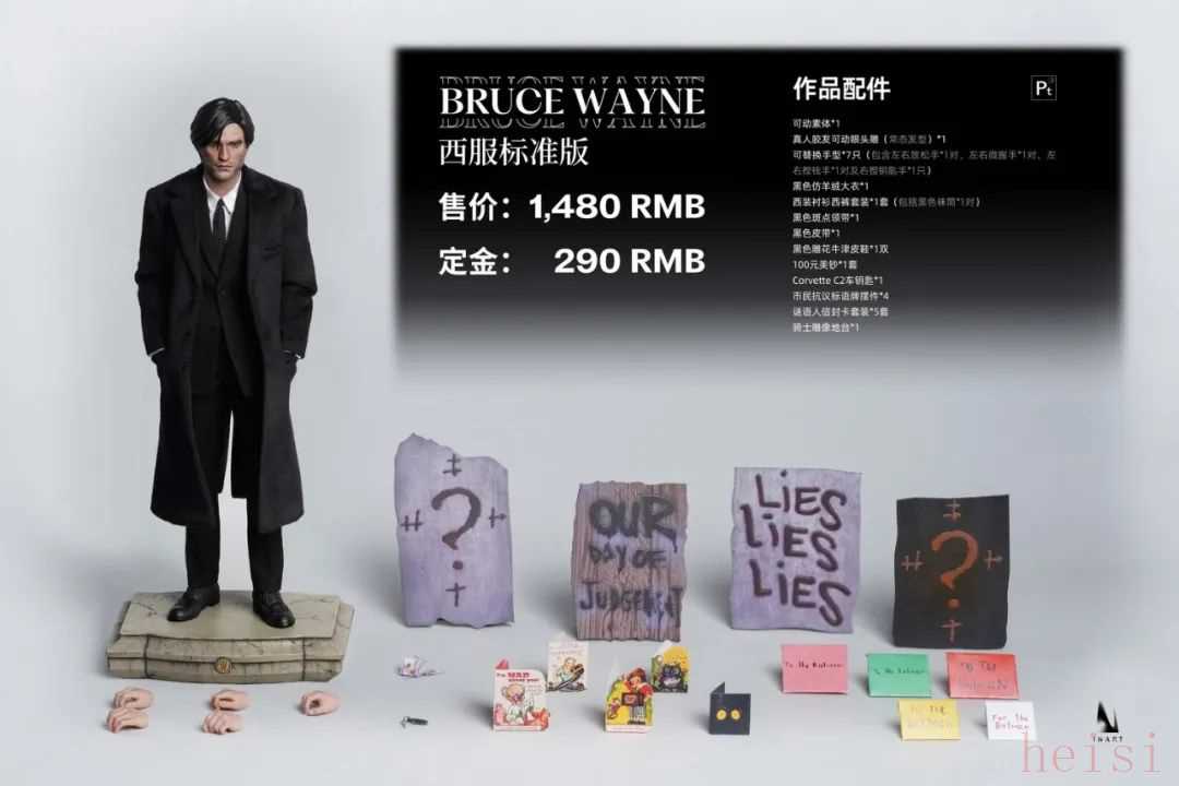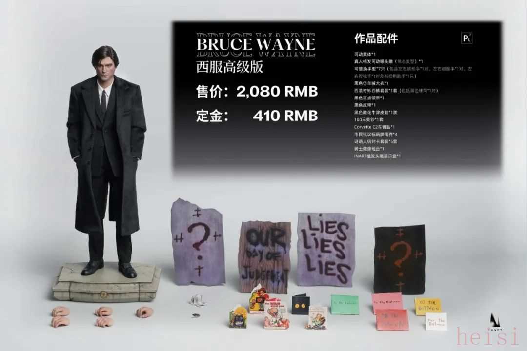 INART还带来了一款西服版的布鲁斯·韦恩西装造型很好的还原了电影而且从官图来看,服装的裁剪也还不错