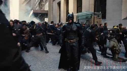 看到这一场面,不禁让人想起了电影《蝙蝠侠:黑暗骑士崛起》里这一幕:蝙蝠侠和警察与电影里反派发生冲突。