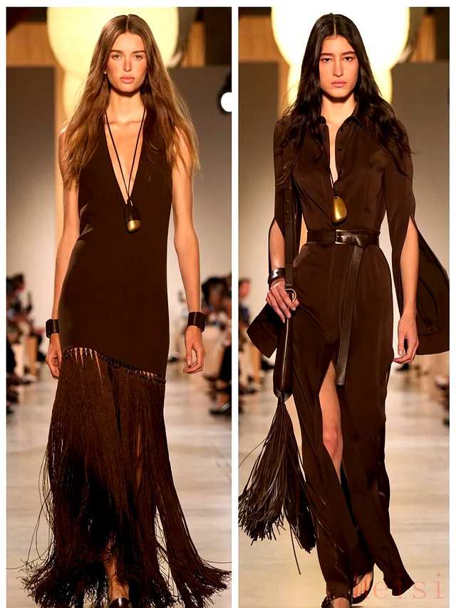 材质也玩花样。麂皮做外套,皮革做腰带,流苏做手袋,三种肌理往身上一摞,层次立刻鼓起来。金属面料只露一条边,像刀背闪过的冷光,把柔软布料衬得更暖。刚柔并济,身价就上去了。