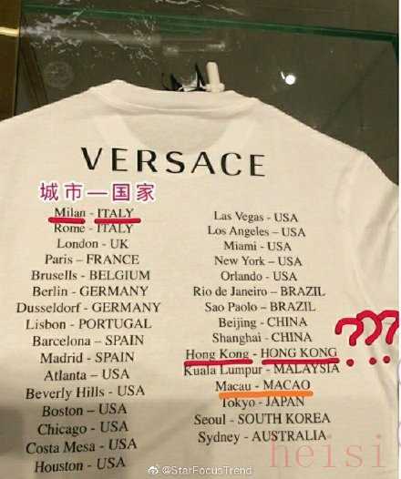 8月11日,有网友发现在范思哲的服装上,同为中国城市的北京、上海对应的是China(中国),但香港和澳门对应的却是Hongkong(香港)、Macao(澳门)。