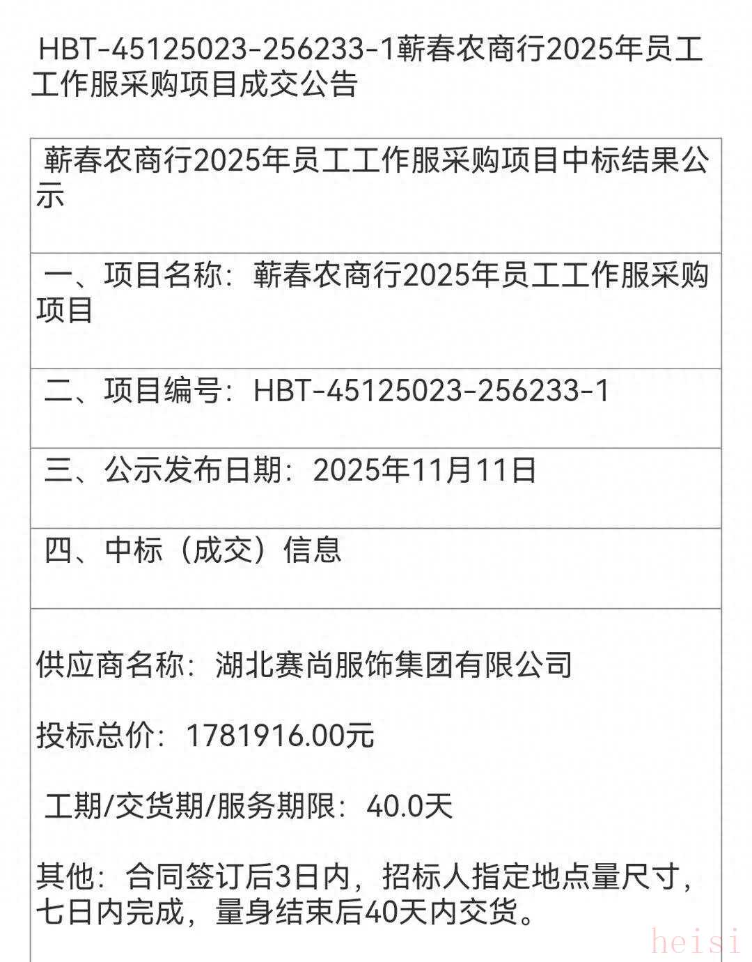 近日,湖北黄冈蕲春县农商行发布的一则中标公告显示,该行今年花178.2万元为489名员工购买工作服。另据媒体报道,此次中标的湖北赛尚服饰集团有限公司还曾在2024年、2022年中标该行的工作服采购项目;加上其他中标企业,该行4年3次采购同品类工作服,累计费用超过619万元。
