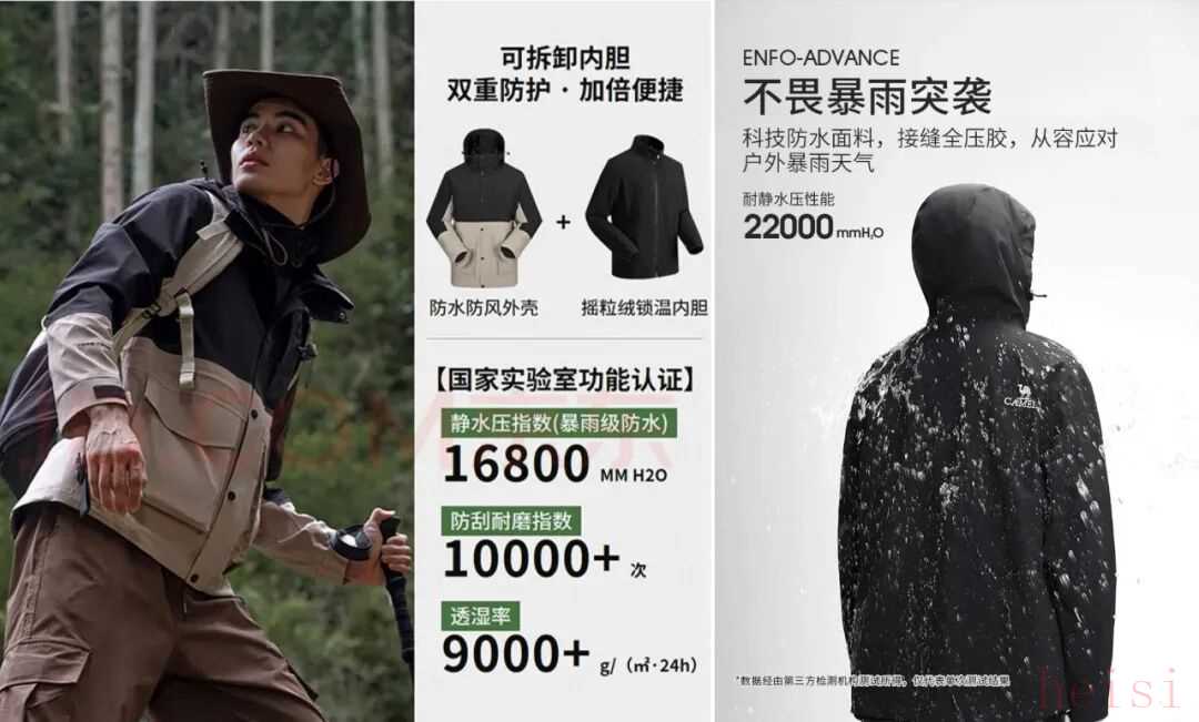 如果只看发布会和物料,美邦给“平替始祖鸟”套上了一层不算难听的科技外壳。从技术标注上看,“华夏之壳”会反复强调三防面料、防风、防水、防污,在部分宣传里还把静水压防水指数、透湿能力拉出来讲,结论只有一句——“周末徒步、露营完全够用。”但只要把产品摊开横向一比,质量上的短板就藏不住了。美特斯邦威一款价格为269元的冲锋衣静水压防水指数16800mm、防水透湿9000g;而299元的骆驼牌冲锋衣防水指数能做到22000mm、防水透湿12000g。