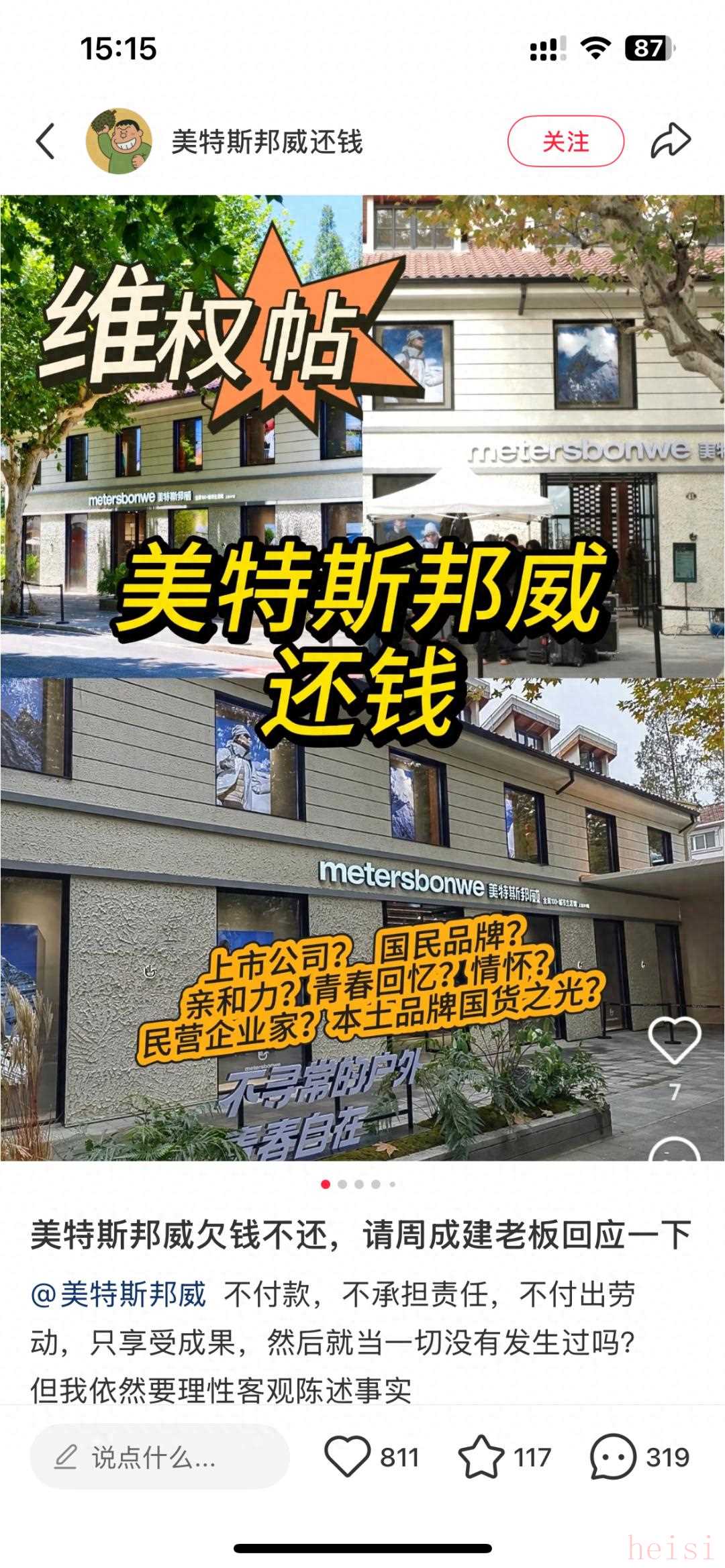 作者|桃酥“广告已经播放了,钱却一直没到。”昨日的双十一,本该是各大品牌的狂欢之日,但美特斯邦威却被一则追债声明拉进了大众视野。据《钱江晚报》报道,去年8月至12月,吴先生广告公司承接了美特斯邦威在新疆、上海、云南等地的广告拍摄。让他没想到的是,公司上下辛苦忙活了几个月,按期交出了成片,对方却迟迟不付钱,总计欠款达184万元。目前,该公司也在小红书上发声,并@美特斯邦威官方号。
