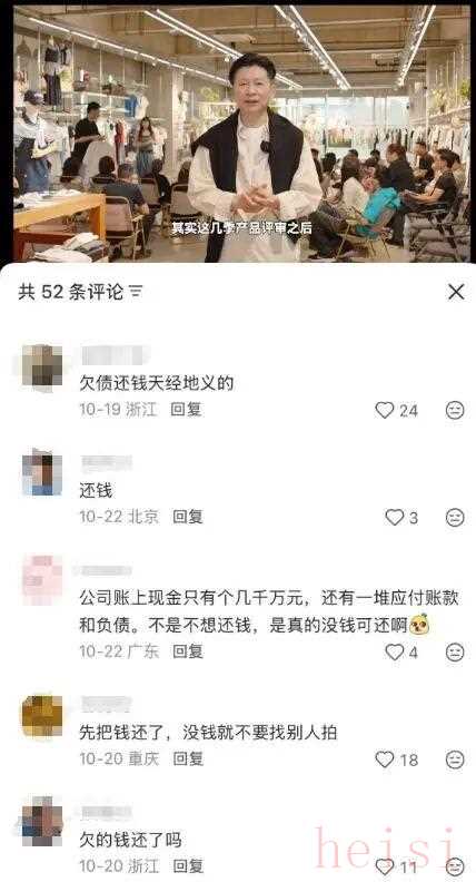 因为迟迟没有收到尾款,吴先生在社交媒体上发布了“美特斯邦威还钱”的帖子,有不少网友在了解事情原委后,纷纷在美特斯邦威品牌创始人周成建的社交媒体账号评论区留言:“欠的钱什么时候还?”