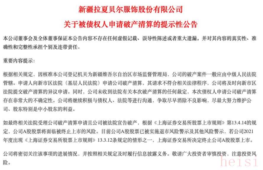 同时,*ST拉夏还表示,未收到法院有关本次破产清算的任何裁定,将及时向新市区法院提交破产清算的异议申请,以及将继续积极与债权人、法院等进行沟通,争取尽早消除不良影响,尽最大努力维护公司、股东特别是中小股东的利益。