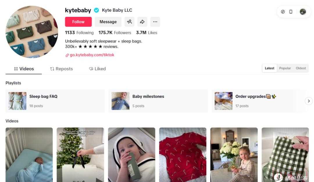 在海外另一社媒TikTok上,Kyte Baby的粉丝数也超过了17万,其账号内容大多为婴儿着装实拍、面料展示、亲子互动等。