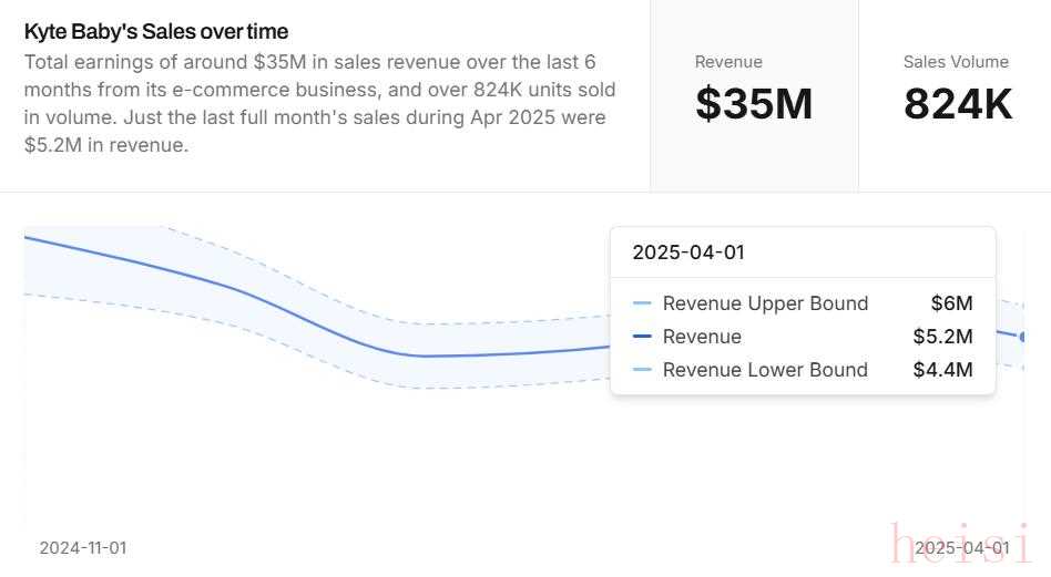 根据Particl数据统计,2024年11月至2025年4月,Kyte Baby实现销售收入约3500万美元,累计售出82.4万件产品;其中,2025年4月月销售额达520万美元。
