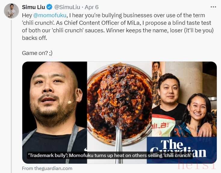 起因是美国韩裔名厨张锡镐(David Chang)旗下餐饮集团Momofuku(福桃)在美国抢占了“chile crunch(香辣脆,也被视为油辣椒)”商标并正在申请“chili crunch”商标,今年3月起到处发律师函“维权”,让别人停售使用这俩词的产品。由于福桃针对的都是小型企业,被质疑商业“霸凌”,加拿大华裔演员刘思慕也忍不住发声驳斥。