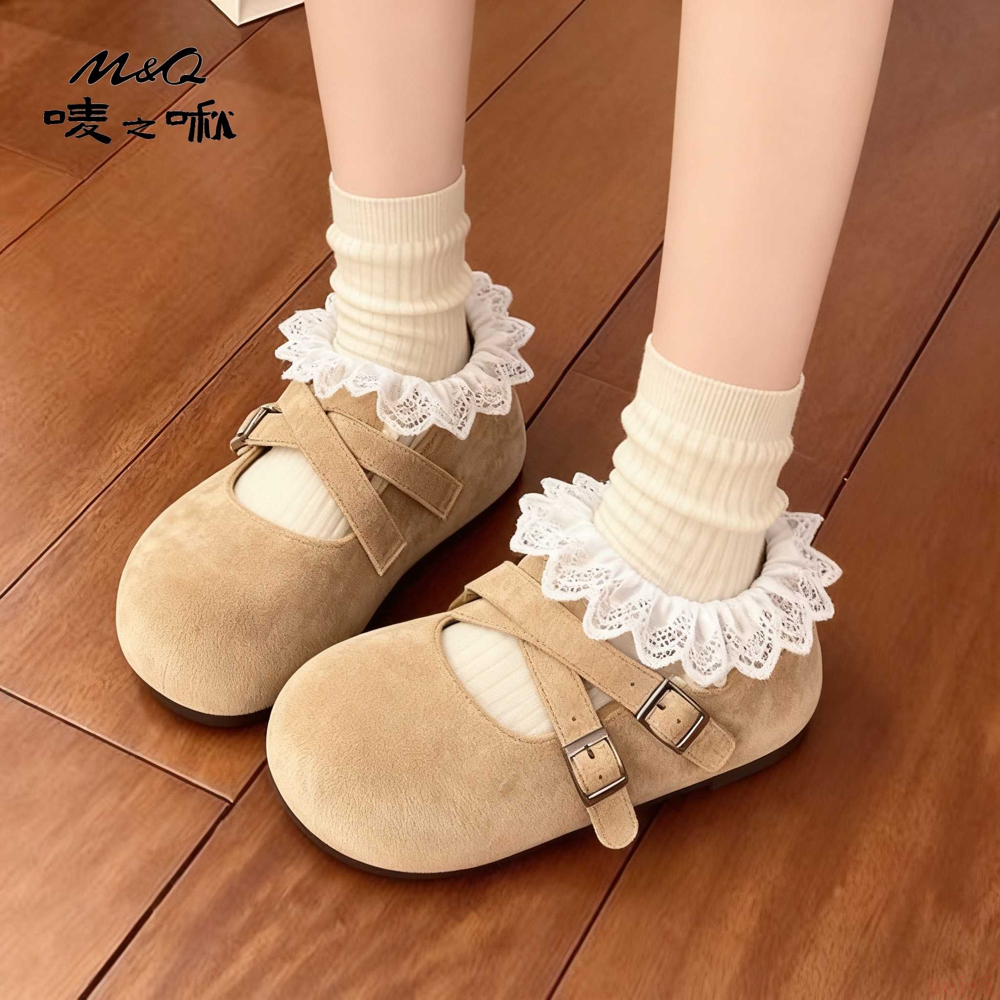米黄色绒面交叉搭扣单鞋,蕾丝花边与白色袜子的搭配,仿佛将我们带回了那个充满幻想的少女时代,温柔可爱,又不失个性。